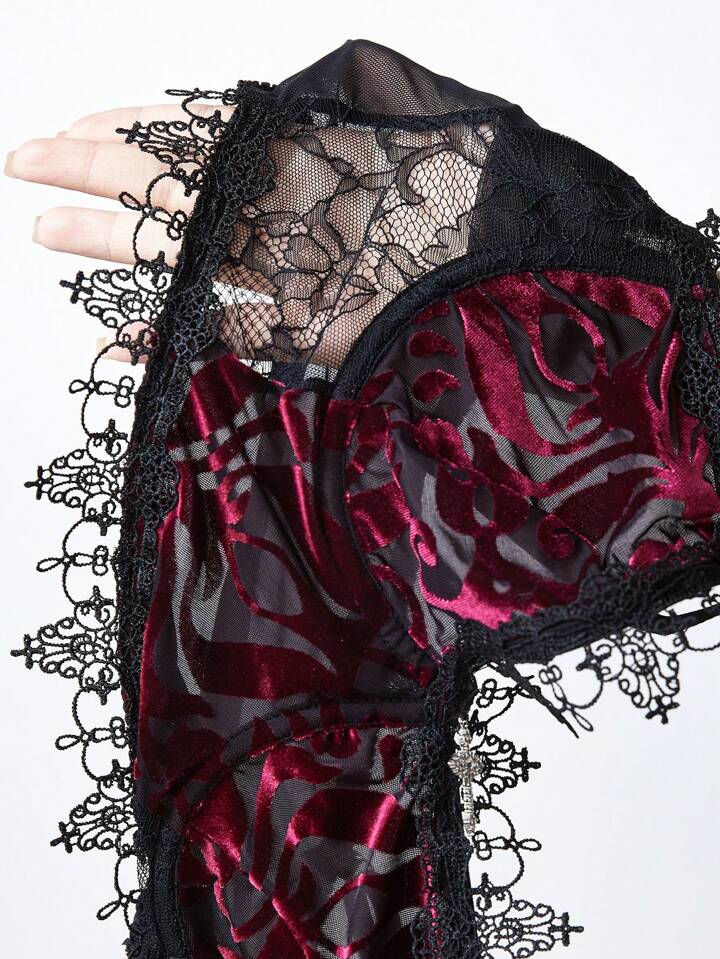Goth Conjunto de lencería sexy con elegante cruz de encaje y terciopelo floreado para Navidad