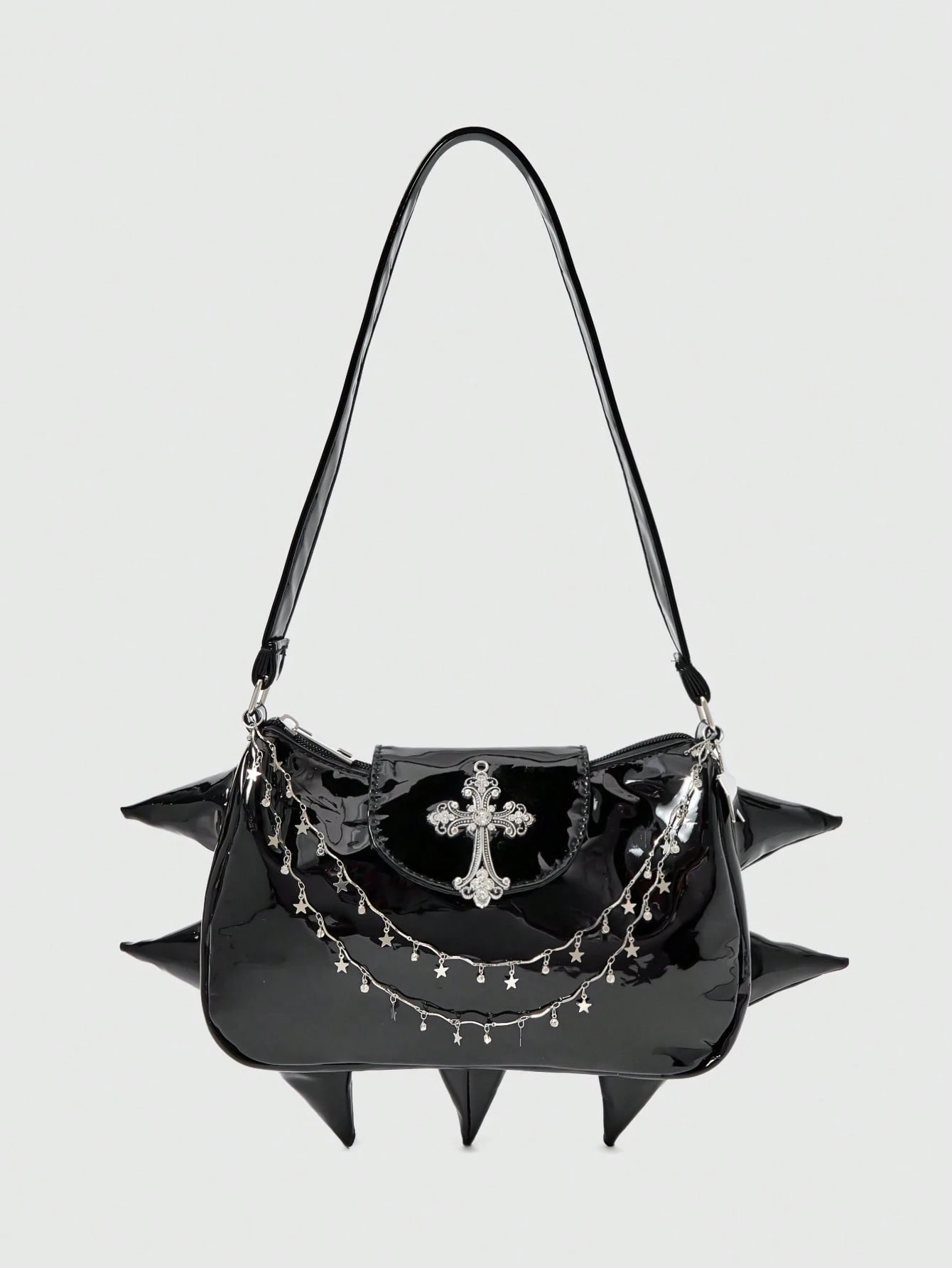 Goth Bolso de hombro negro con decoración de cadena cruzada de moda