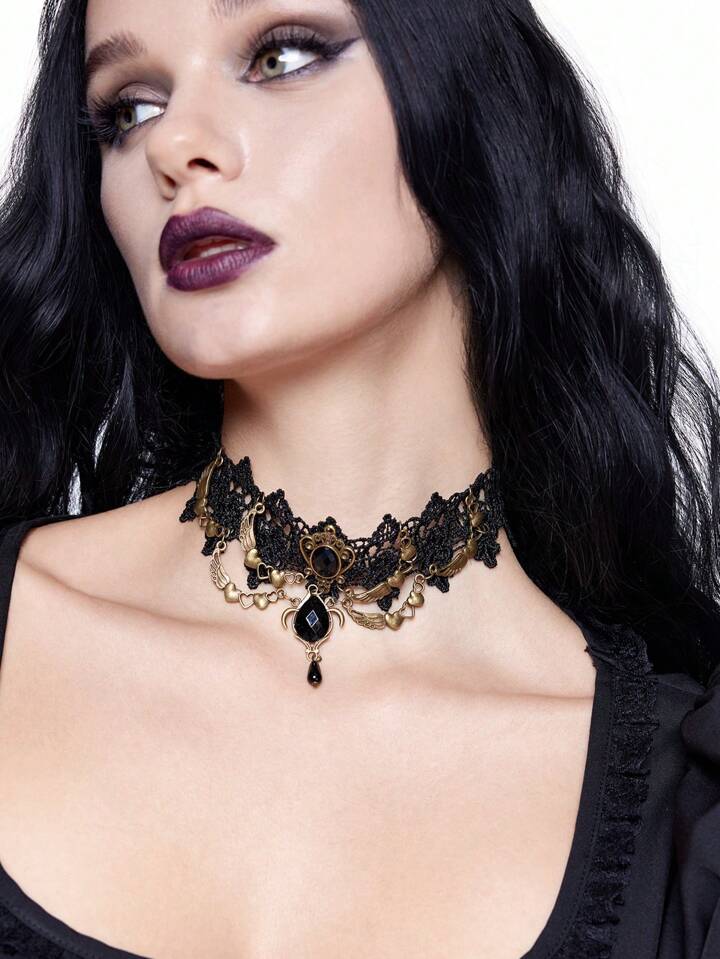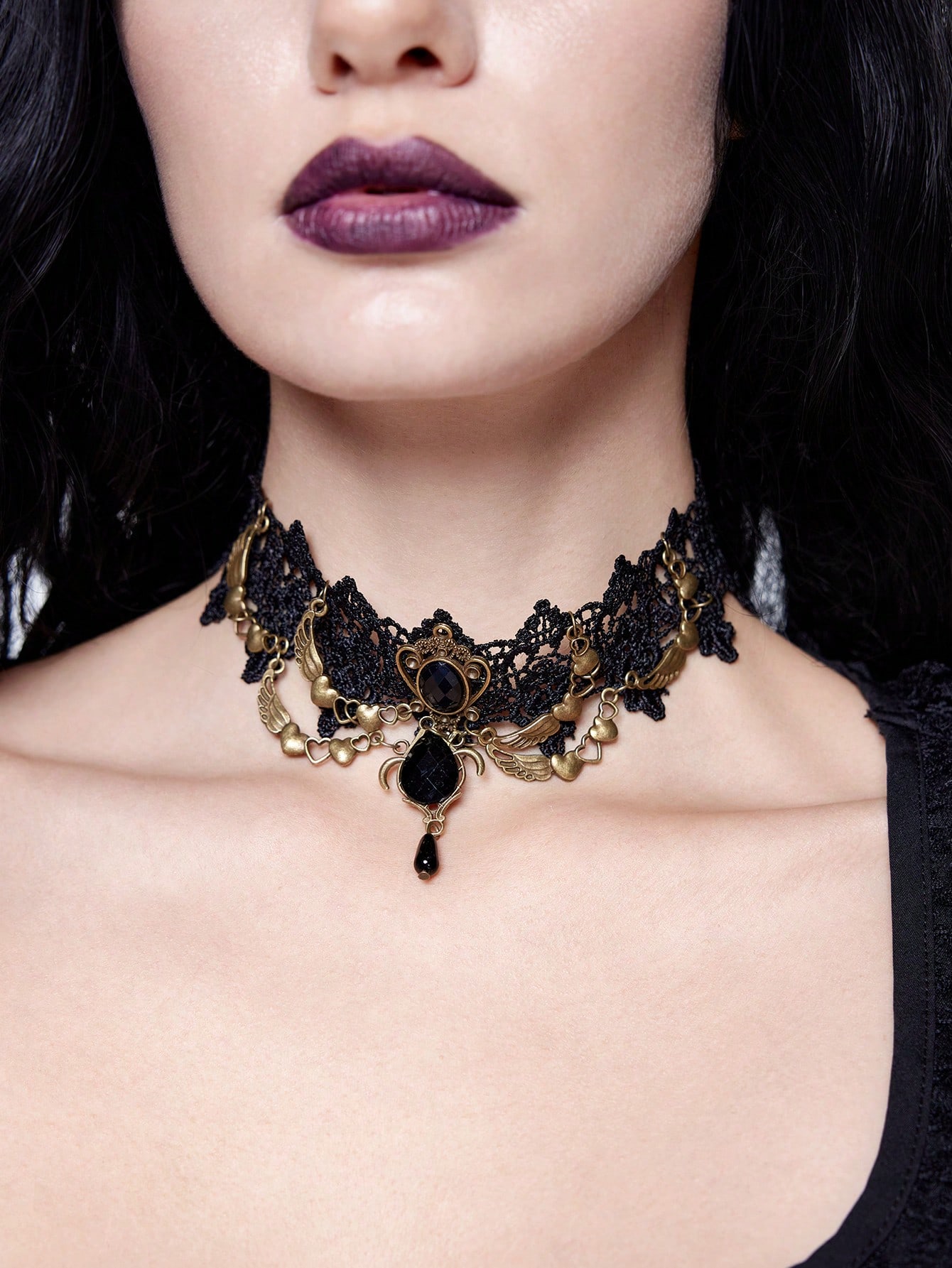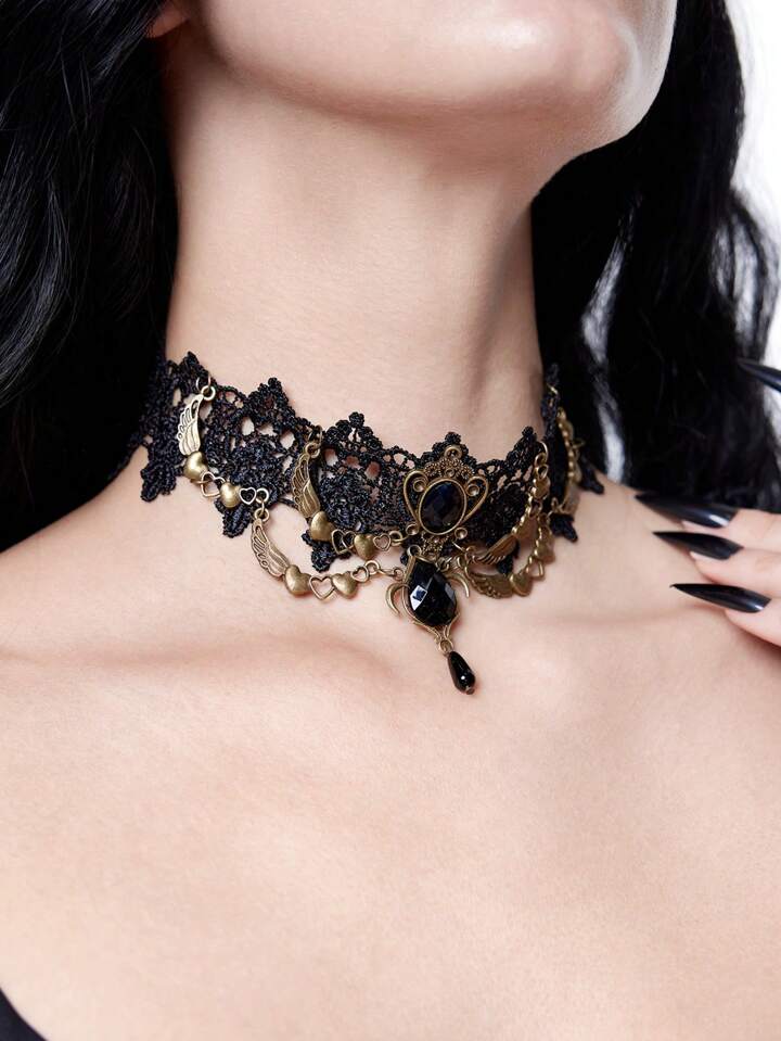 Goth Collar vintage de moda con colgante de corazón y alas de encaje negro