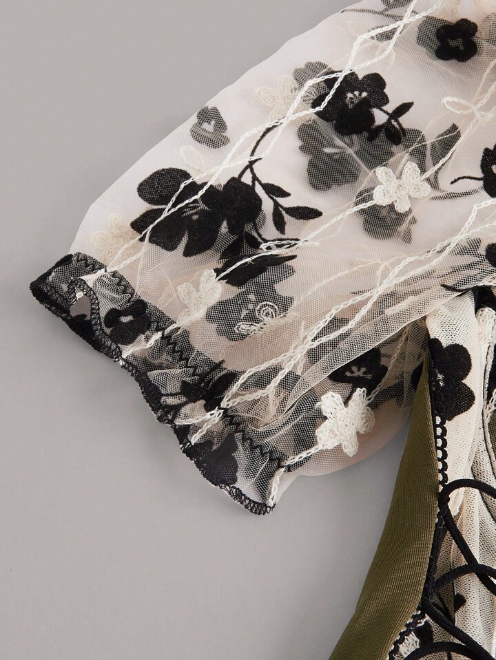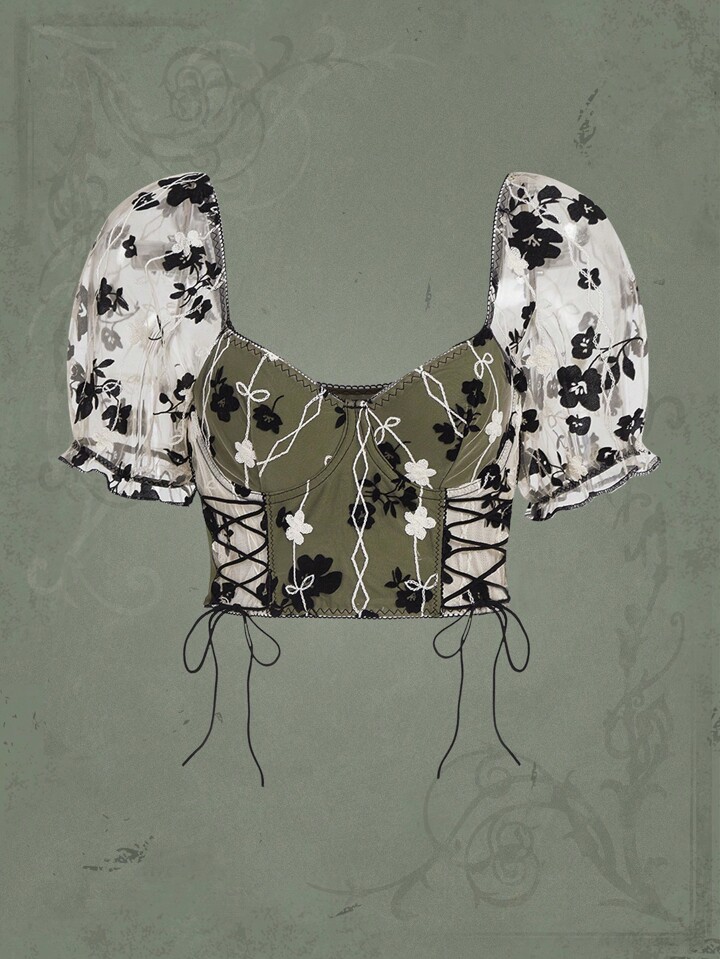 Goth Top crop con bordado floral encaje de malla de manga farol