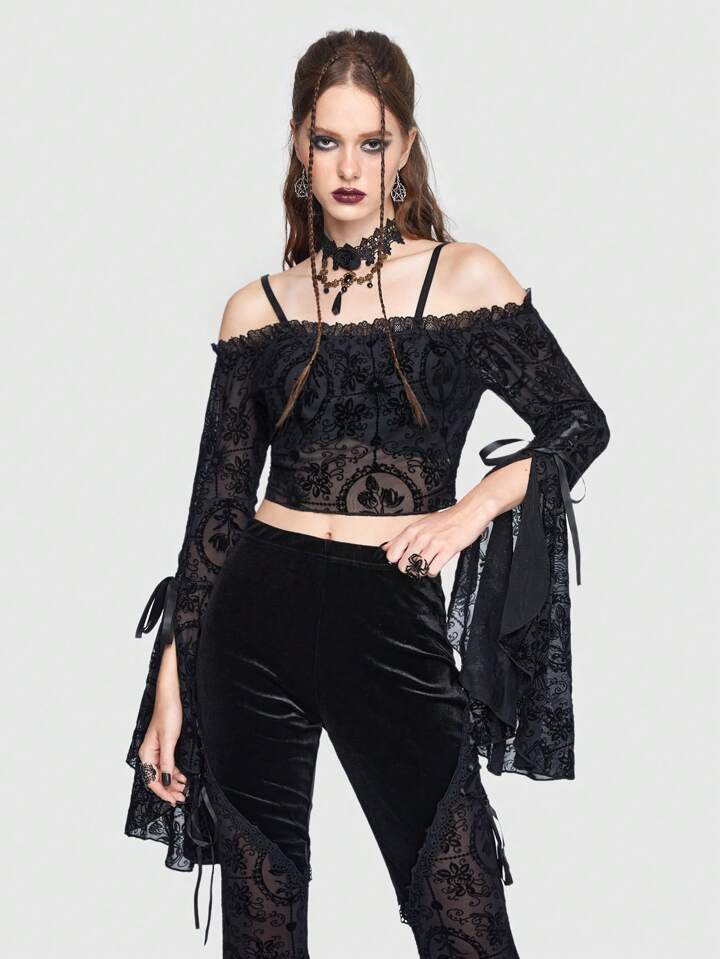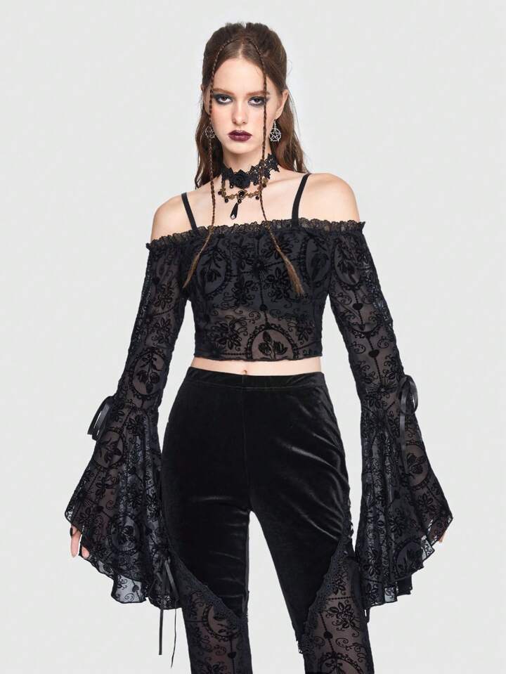 Goth Top crop con estampado floral con encaje en contraste de hombros descubiertos