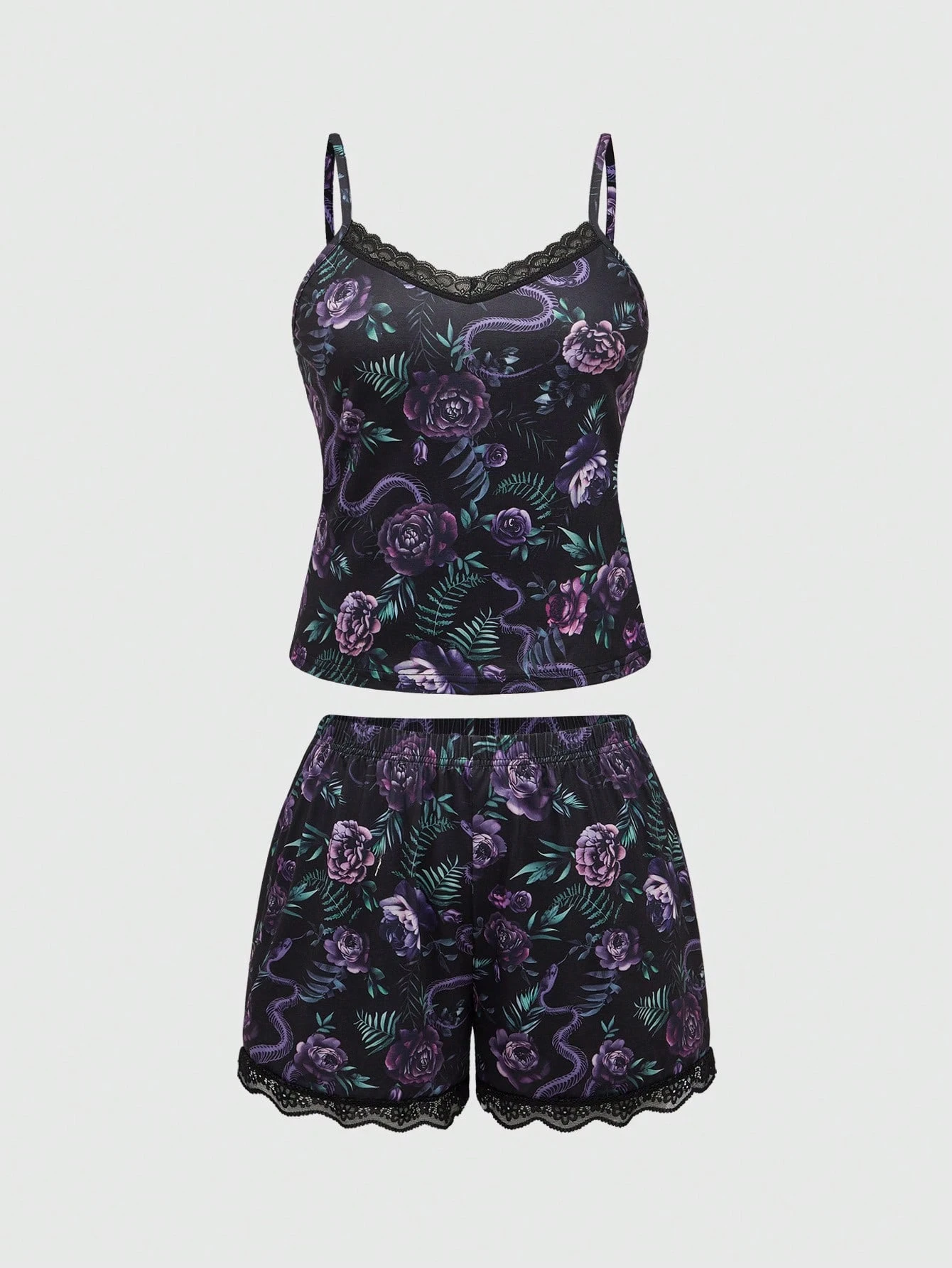 Goth Conjunto de ropa de hogar para verano de talla grande con blusa sin mangas y short de encaje con estampado de hueso de serpiente y flores