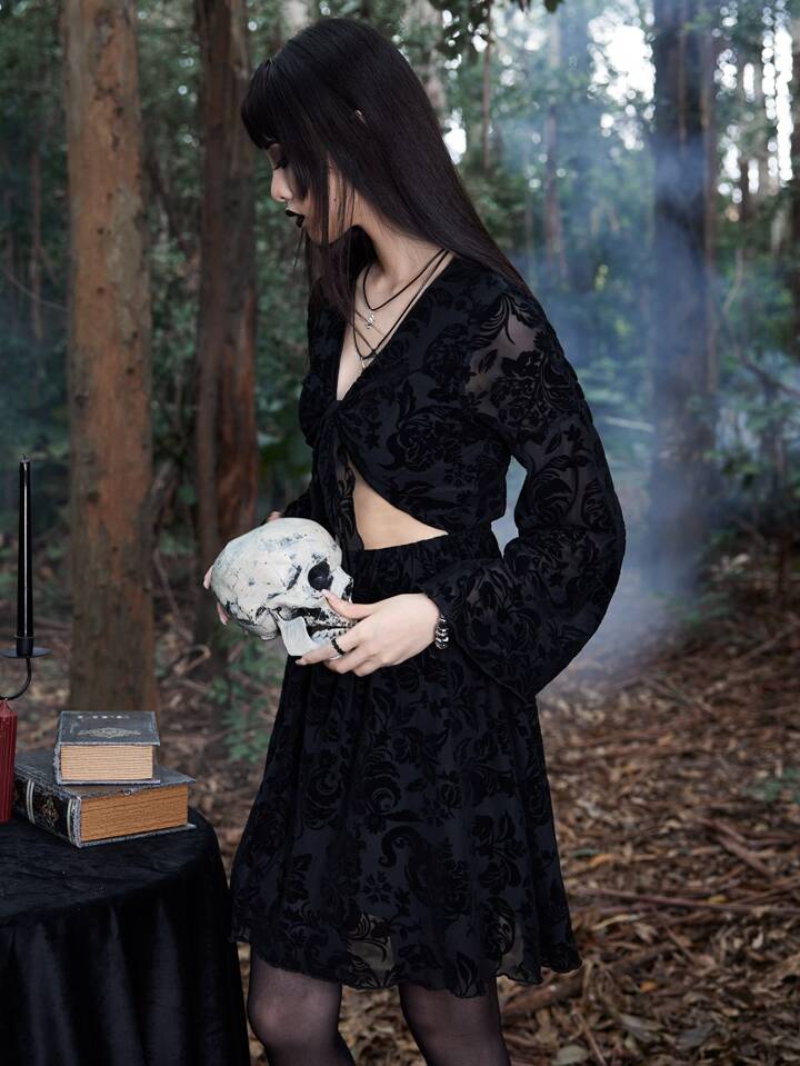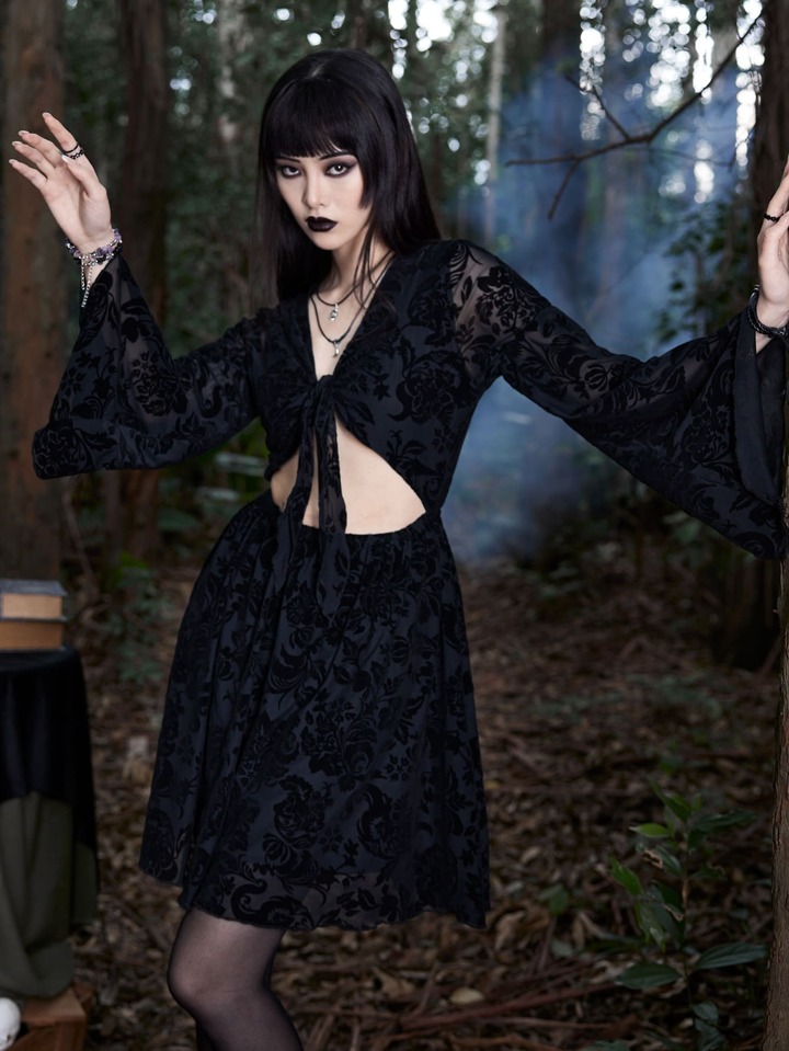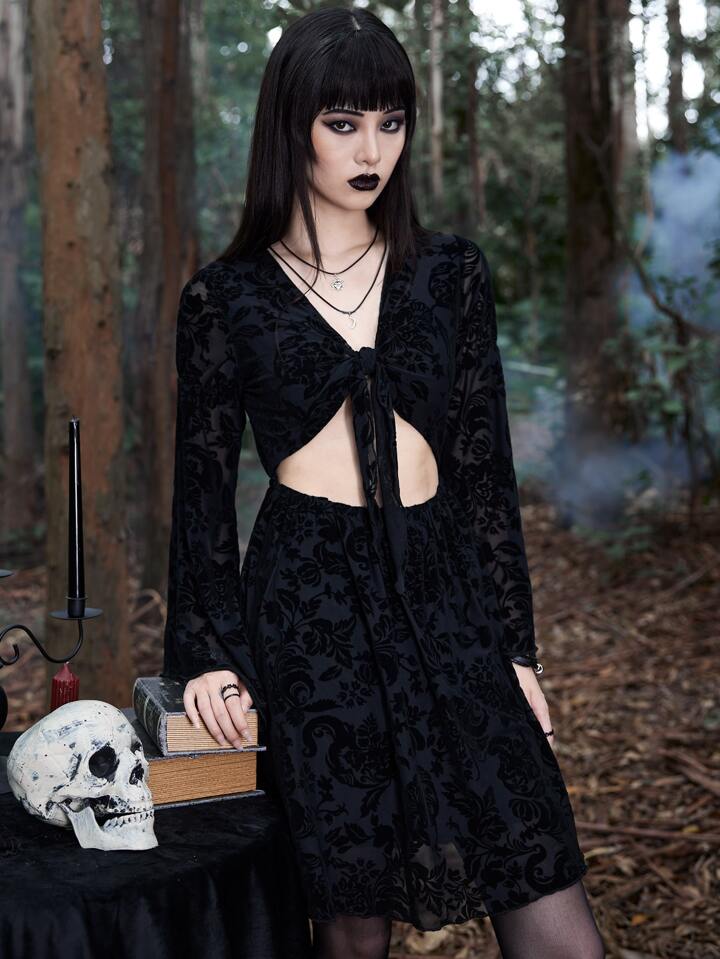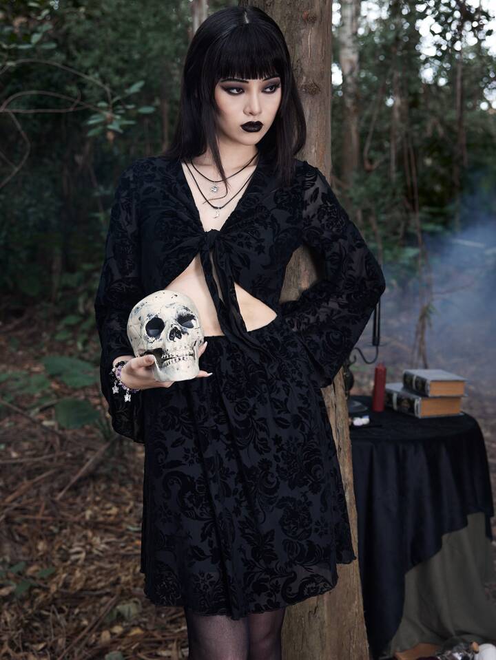 Goth Vestido floral con cordón delantero de manga con volante con abertura