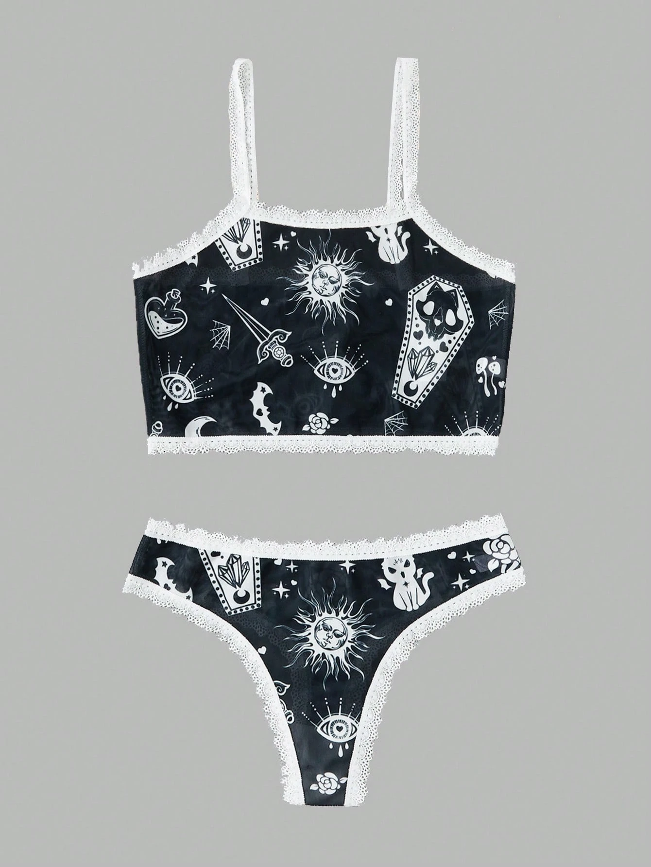Goth Conjunto de lencería de encaje en contraste con estampado de galaxia