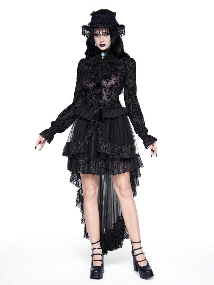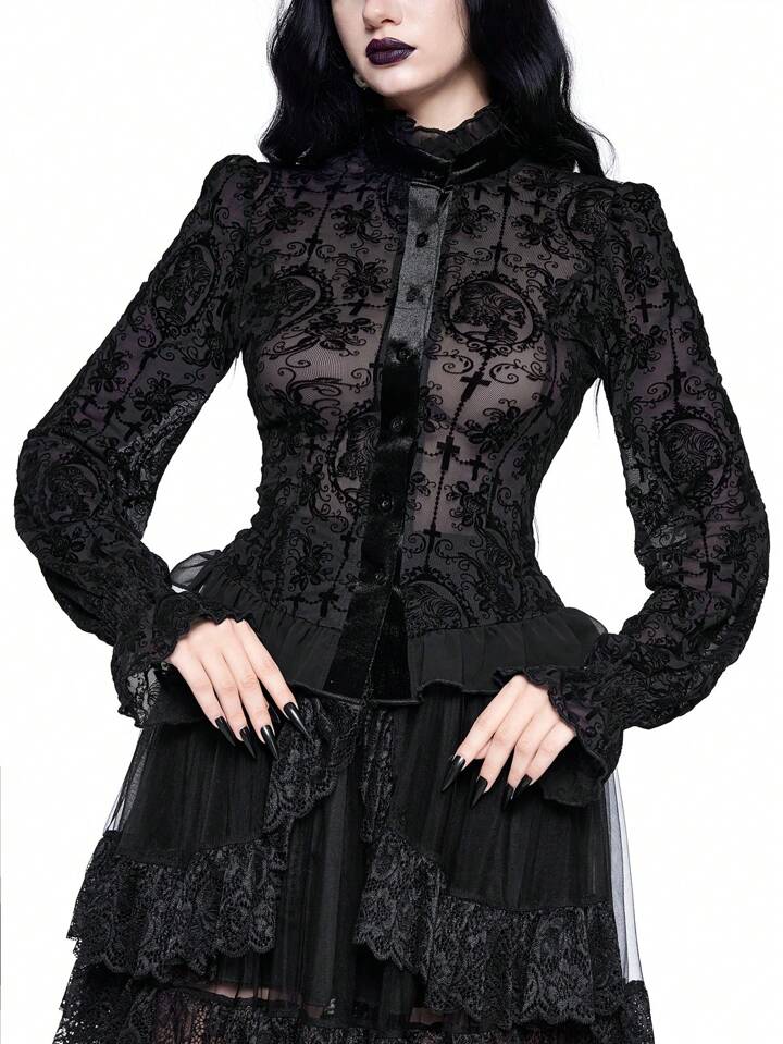 Goth Camisa de mujer con patrón de calavera y cruz, cuello alto, mangas abullonadas y acabado con volantes en estilo gótico
