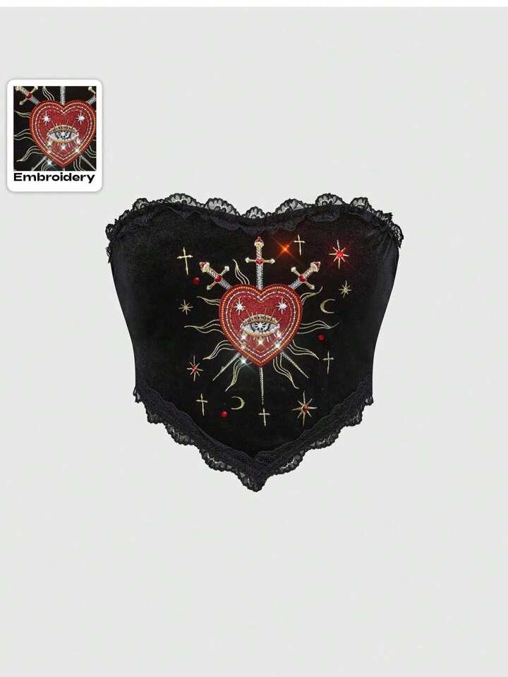 Goth Top de cuello halter con decoración de lágrima de cristal y bordado de corazón, estilo palaciego gótico para mujer