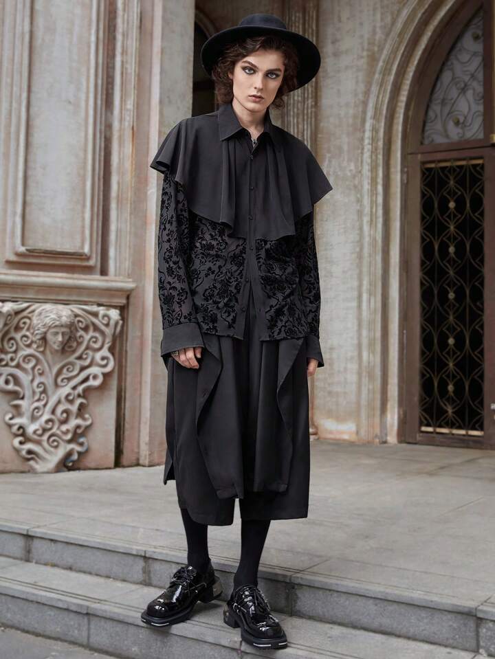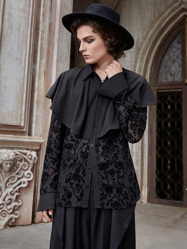 Goth Hombres Camisa floral jacquard ribete con fruncido con botón delantero