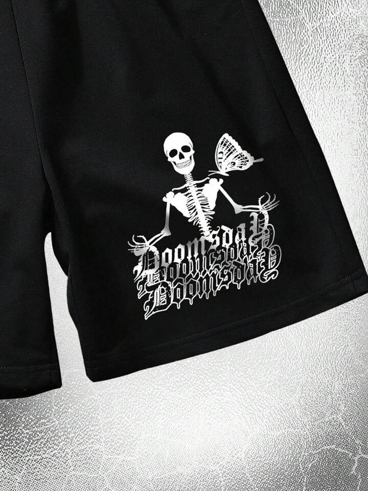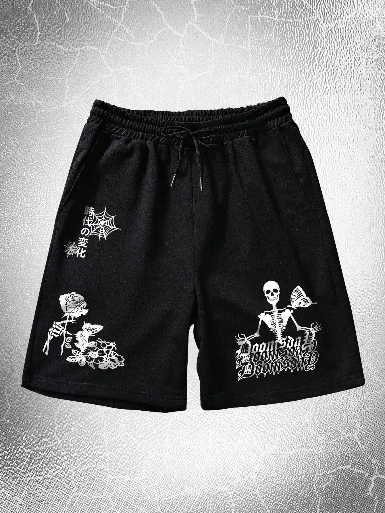 Goth Hombres Shorts con estampado de cráneo y letra de cintura con cordón