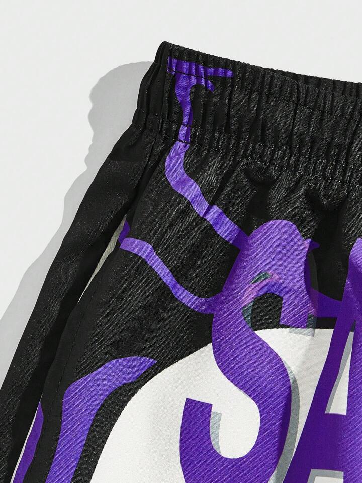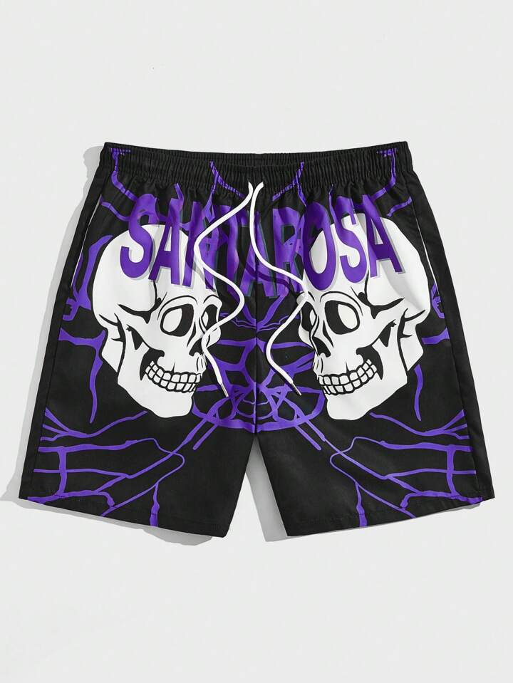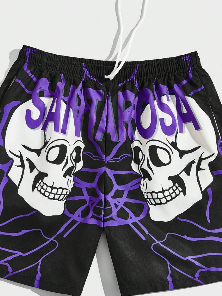 Goth Hombres Shorts con estampado de cráneo y letra de cintura con cordón