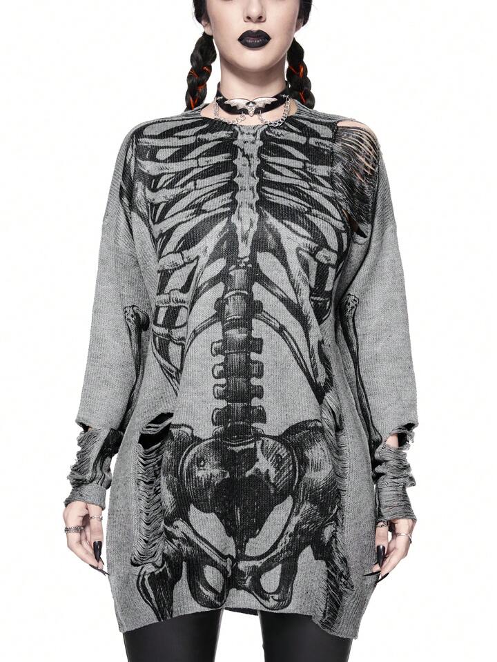 Goth Suéter holgado para mujer con estampa de esqueleto desgastado de Halloween