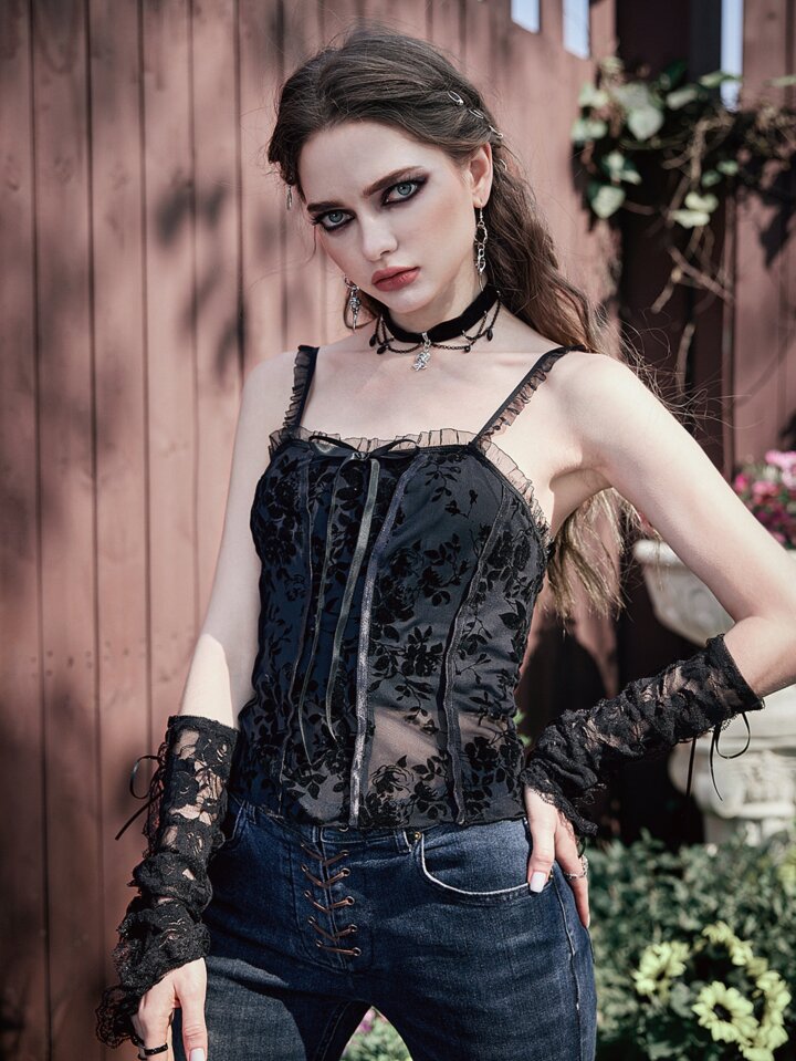 Goth Top de tirantes jacquard ribete fruncido