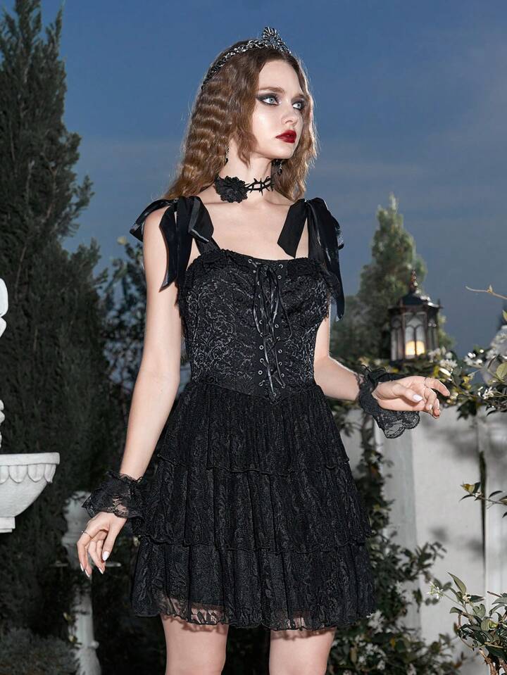 Goth Vestido de tirantes con cordón delantero con encaje