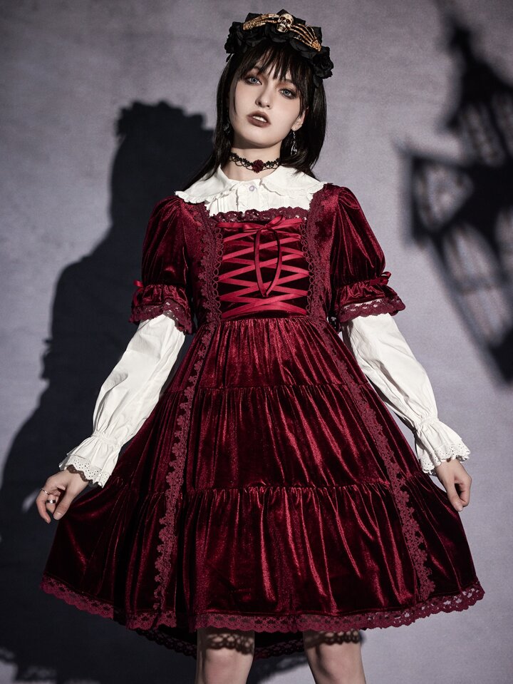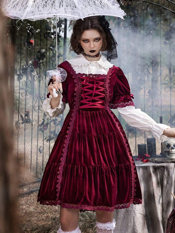 Goth Vestido De Terciopelo Con Ribete De Volantes En El Dobladillo Delantero Y Con Encaje En La Parte Delantera
