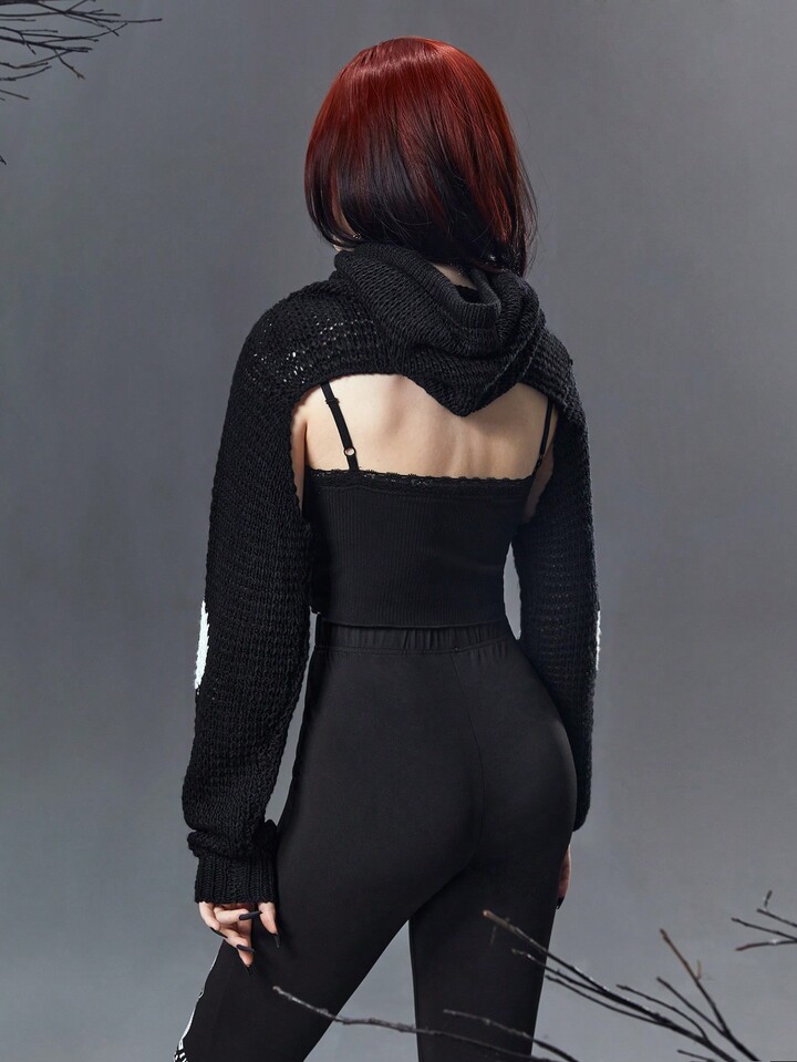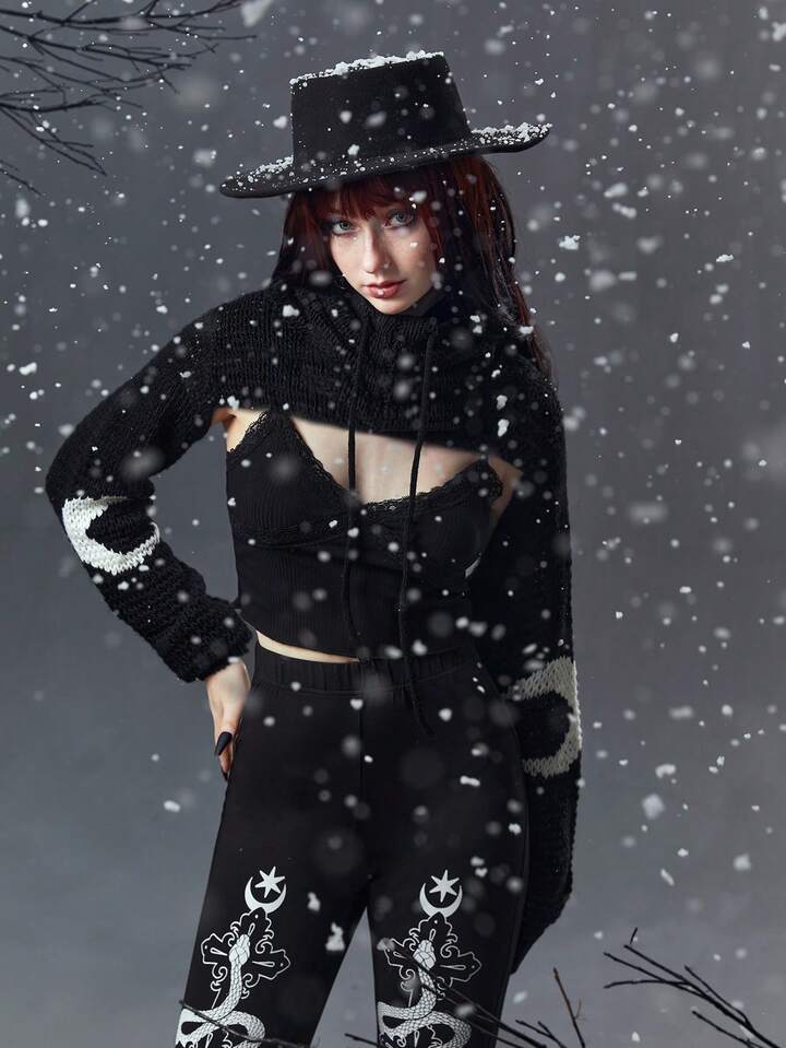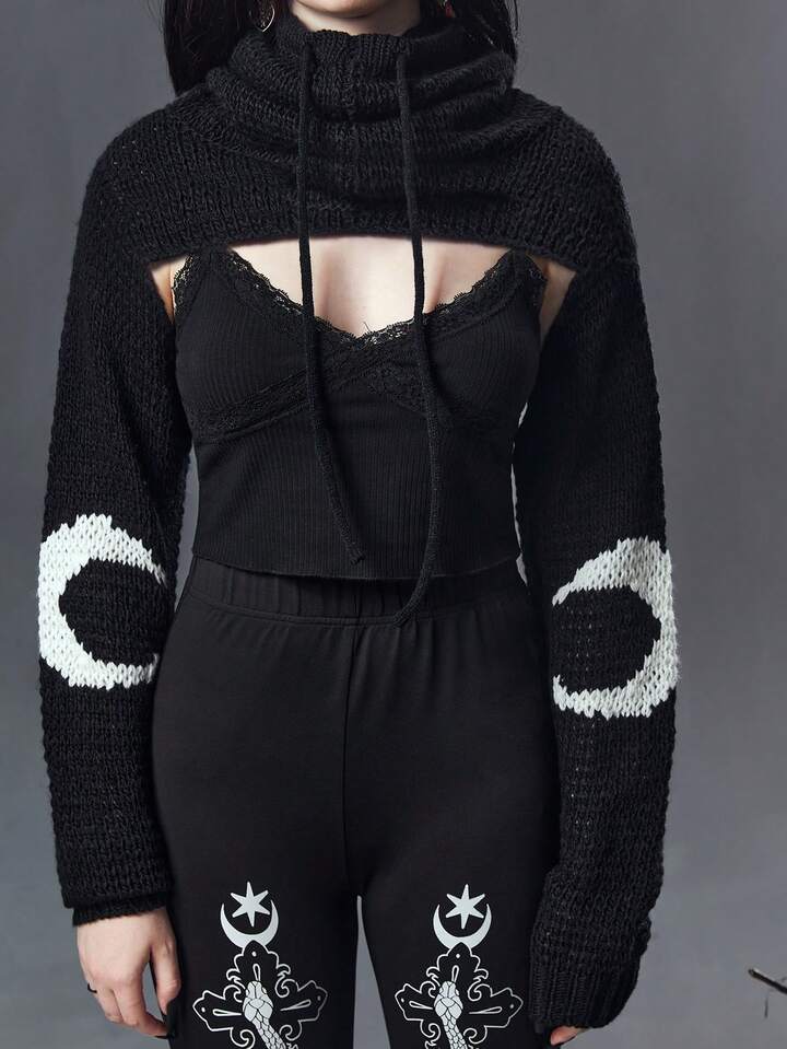 Goth Jersey Ultra Corto Con Capucha Y Cordón Con Patrón De Luna Para Mujer