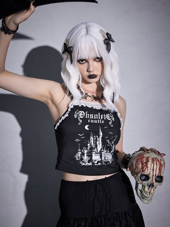 Goth Top De Tirantes Con Encaje Contrastante Con Gráfico De Castillo De Letras
