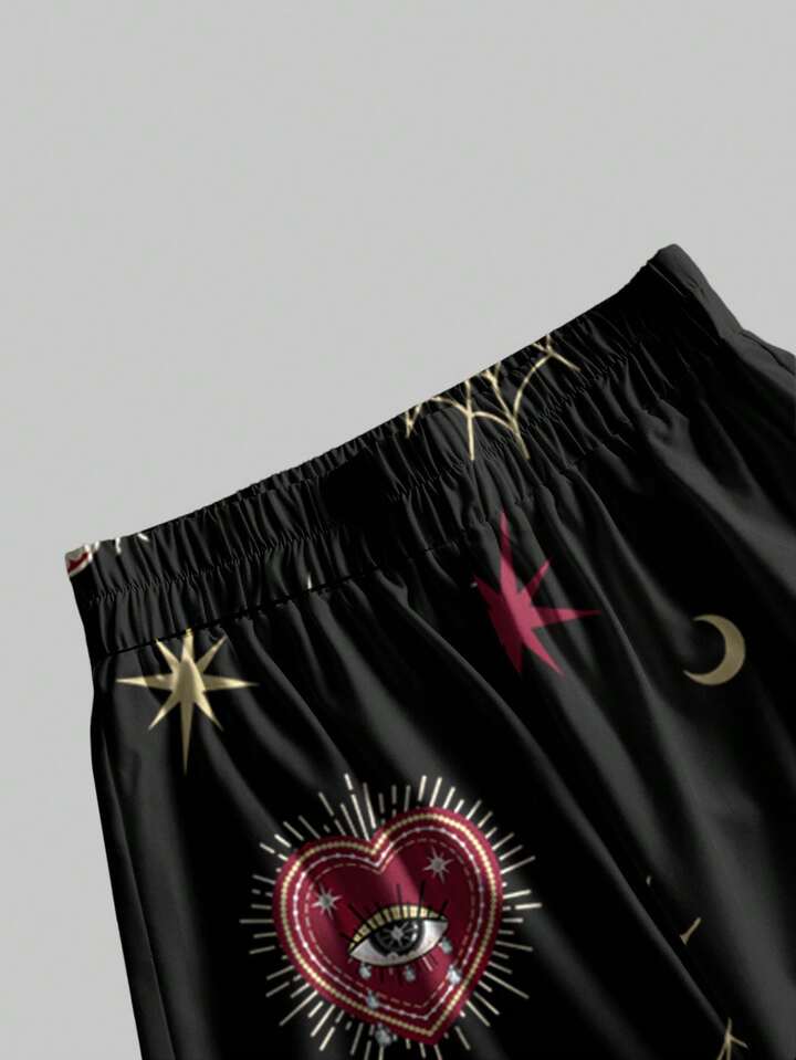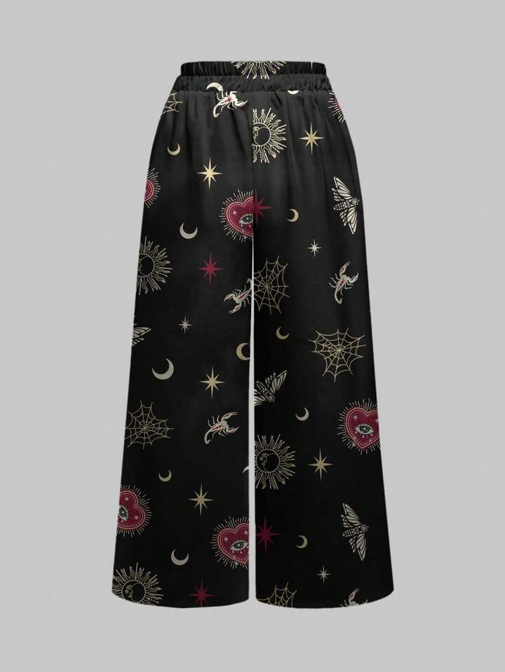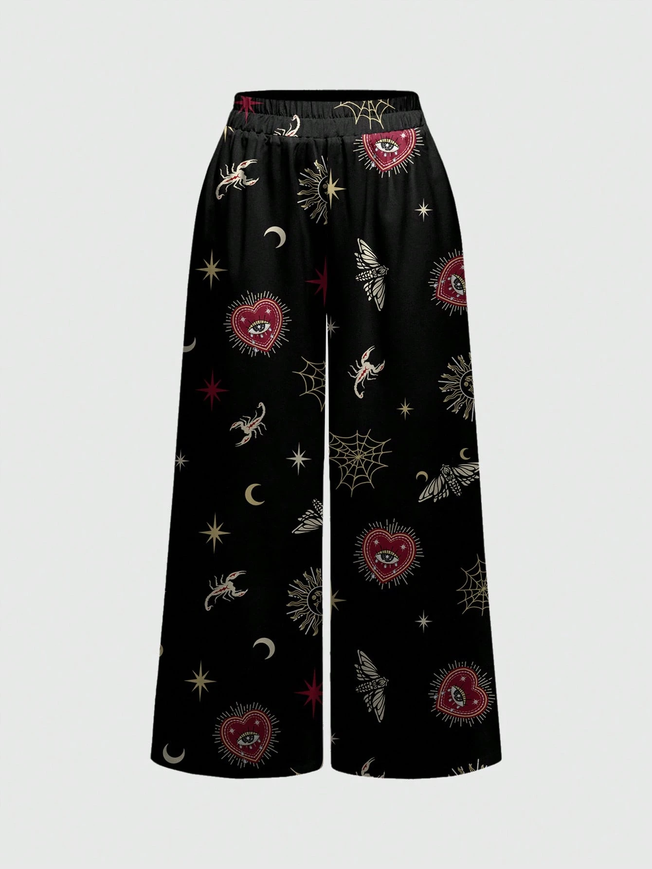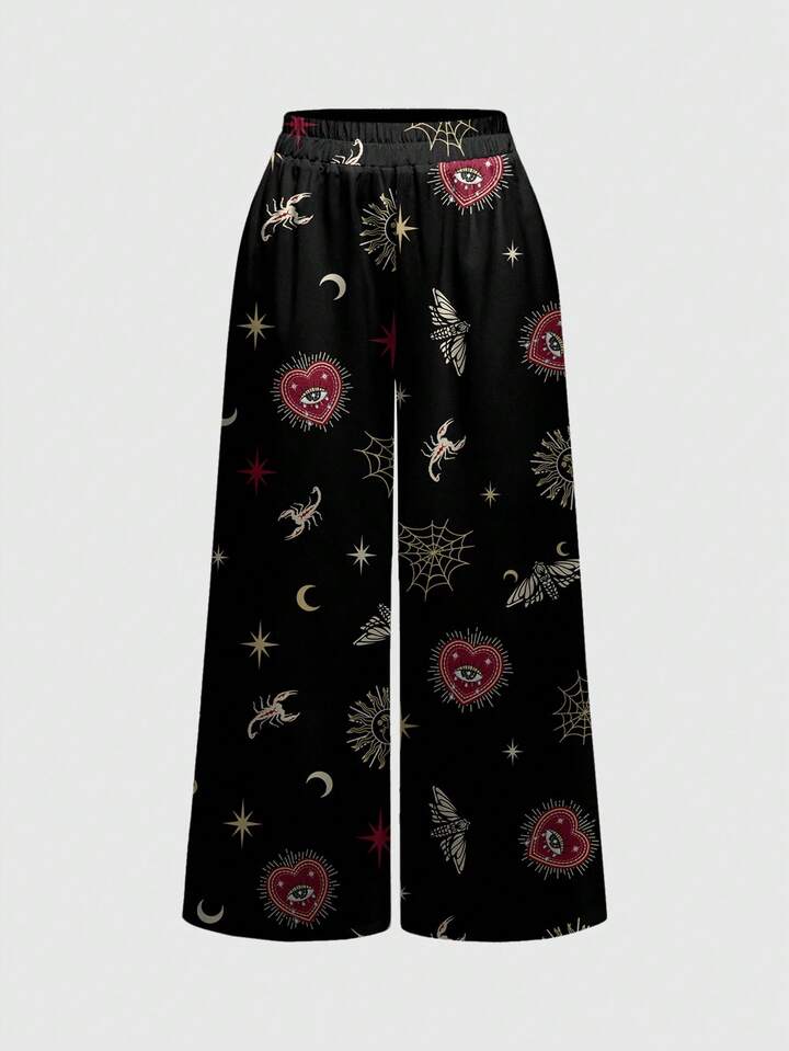 Goth Pantalones anchos de mujer con estampado completo de telaraña, estrella, escorpión y lentejuelas de estilo palaciego lujoso