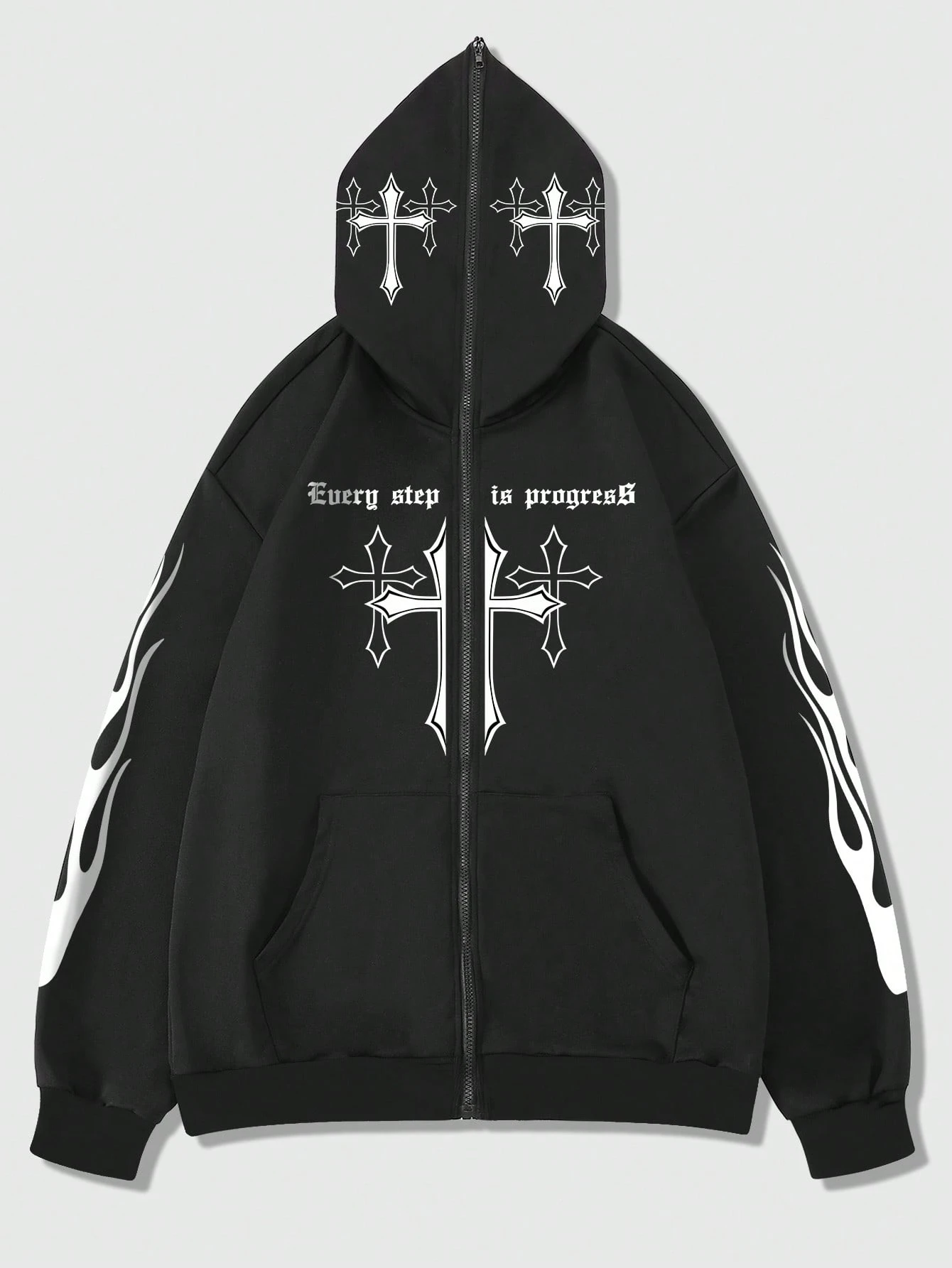 Goth Hombres Cruz Y Eslogan Impresión Con Capucha De Cremallera