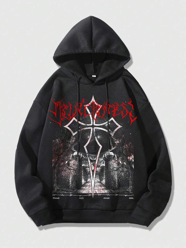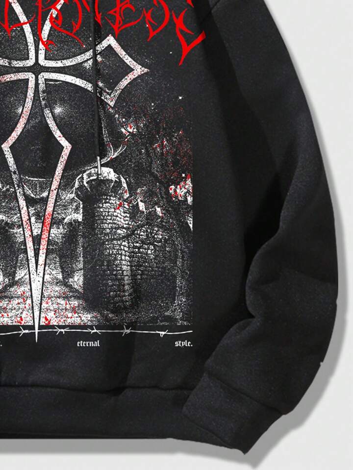 Goth Sudadera Térmica Con Cordón De Impresión De Letras Y Cruces Para Hombres