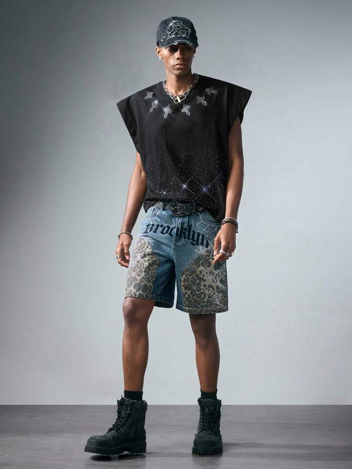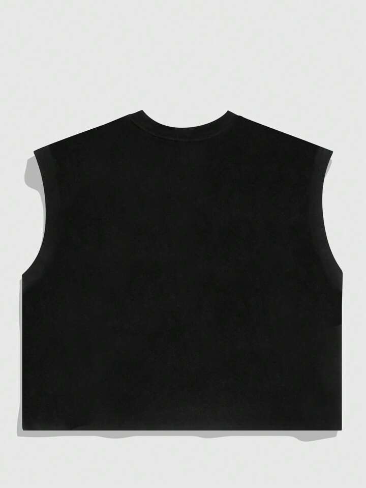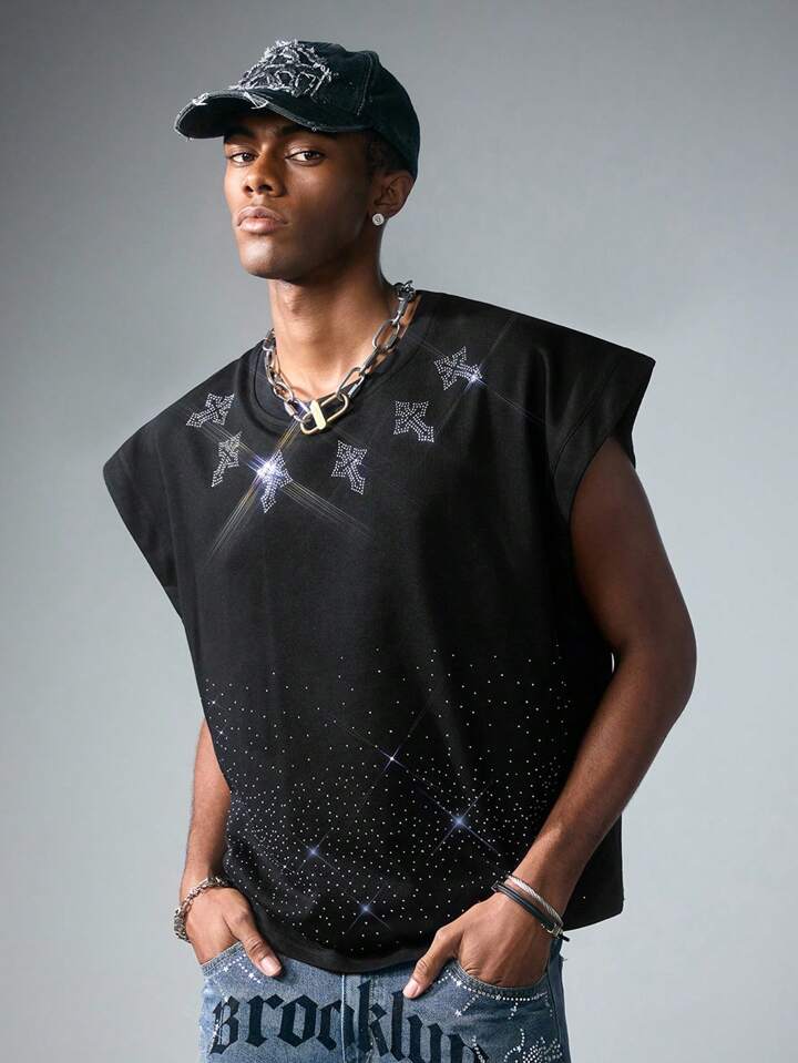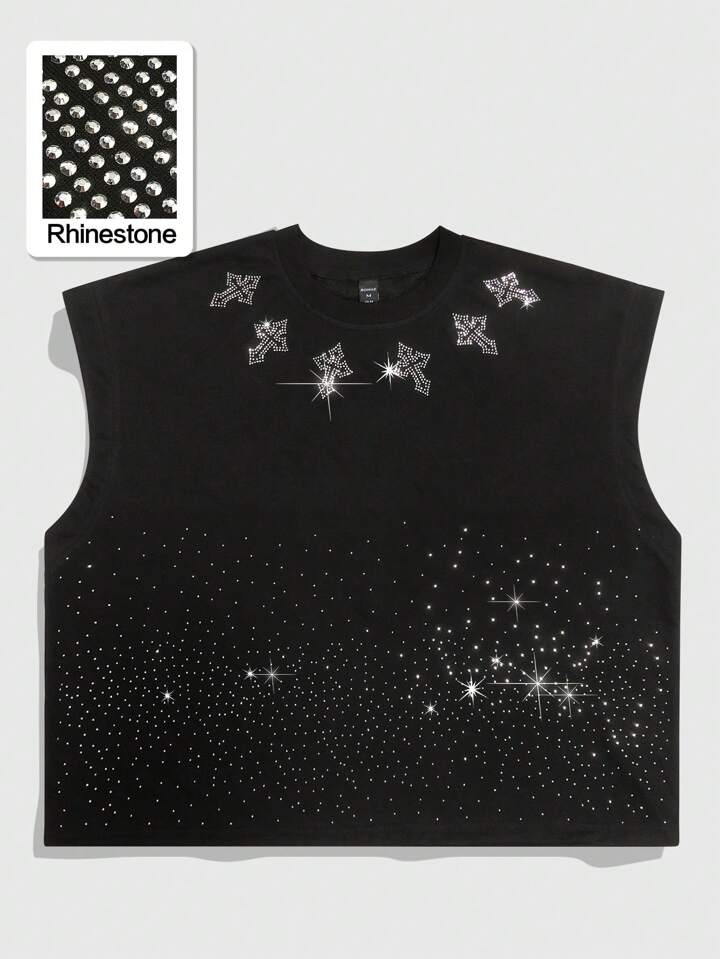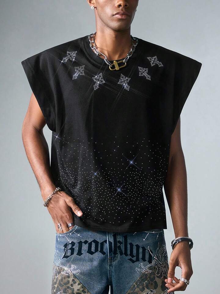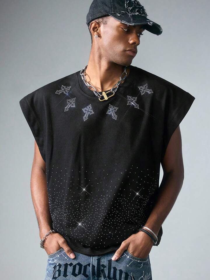Goth Camiseta de tirantes suelta con estampado de cruz de rhinestones brillante para hombres, de verano