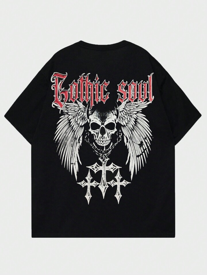 Goth Camiseta De Hombro Caído Con Gráficos De Cráneo Y Letra Para Hombres