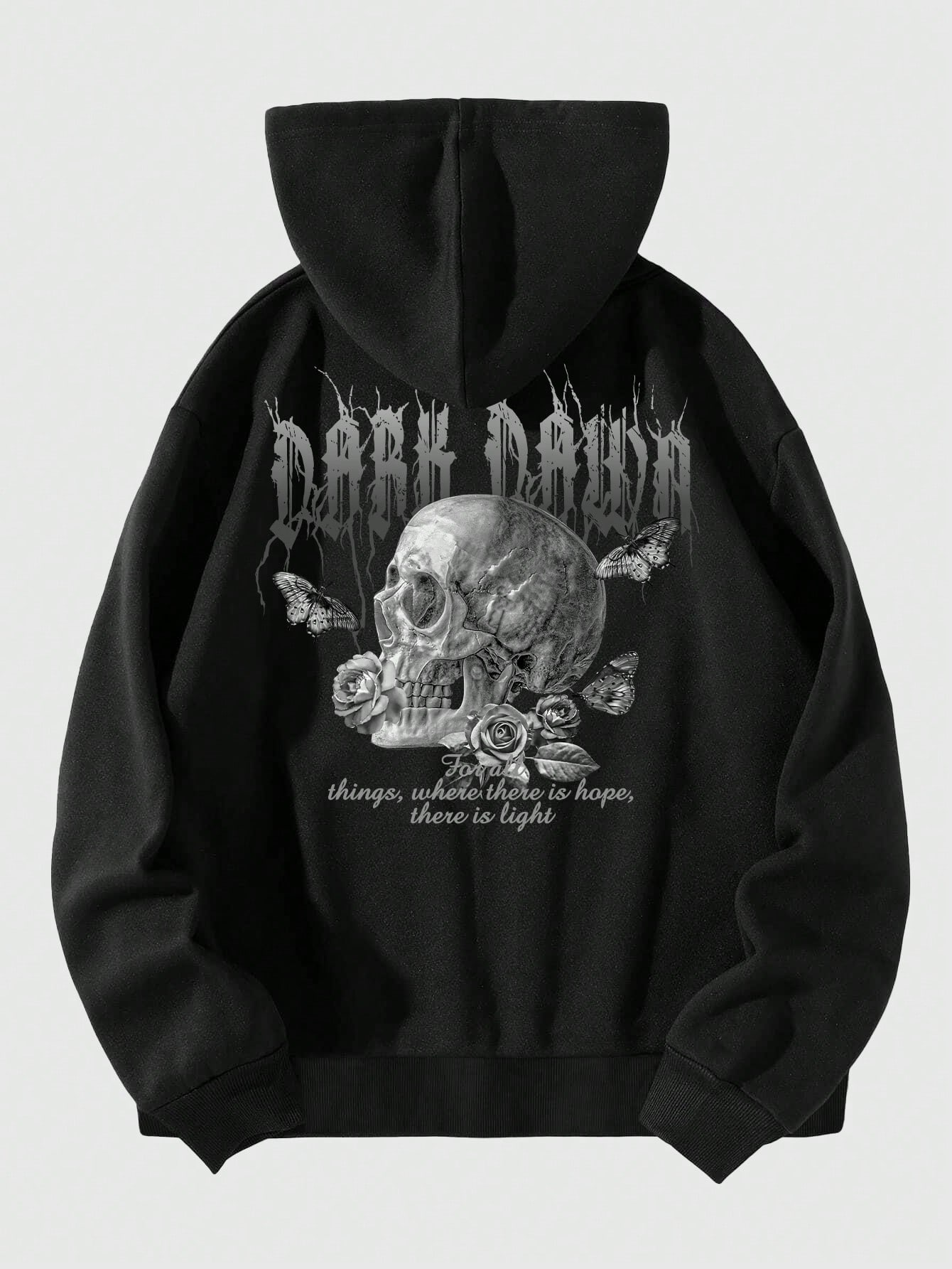 Goth Hombre Calavera Y Eslogan Gráfico Bolsillo Canguro Cordón Térmico Con Capucha