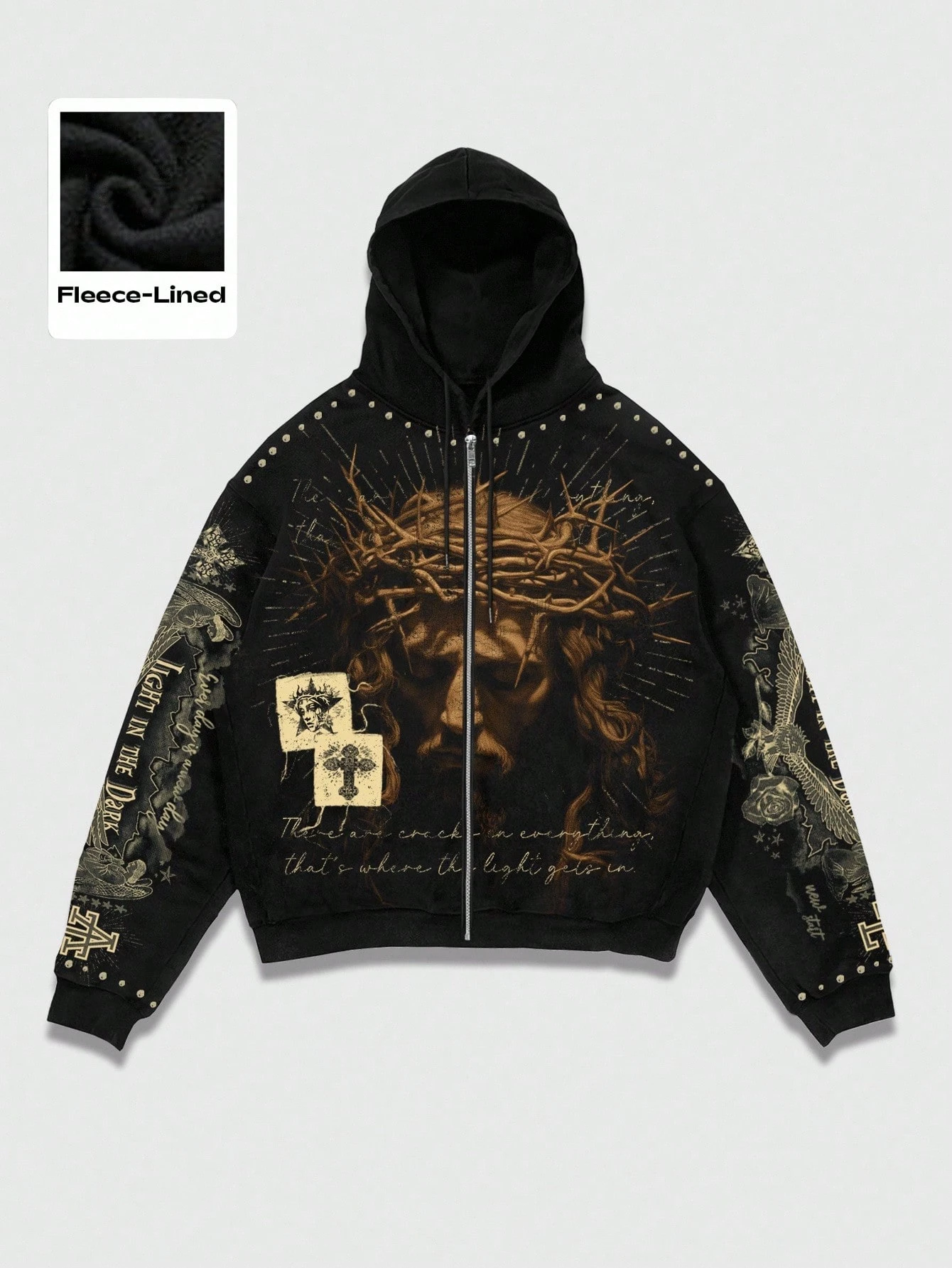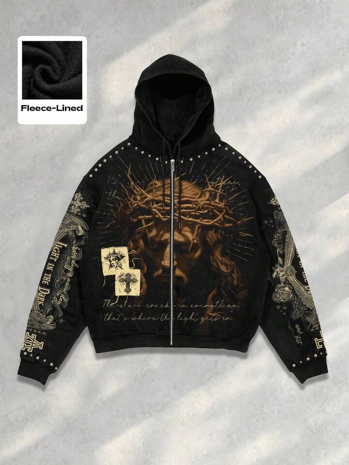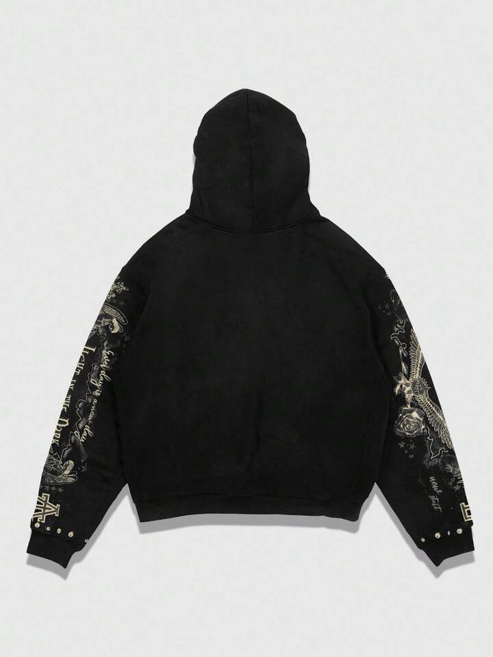 Goth Sudadera con capucha casual de manga larga con cordón, estampado de lema y figura para hombre en otoño