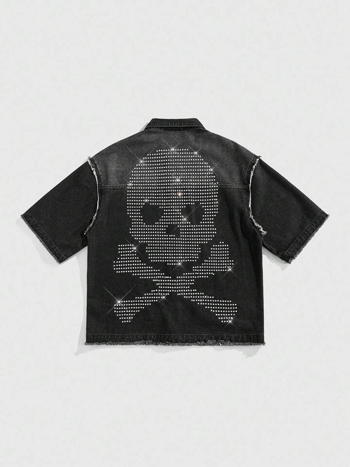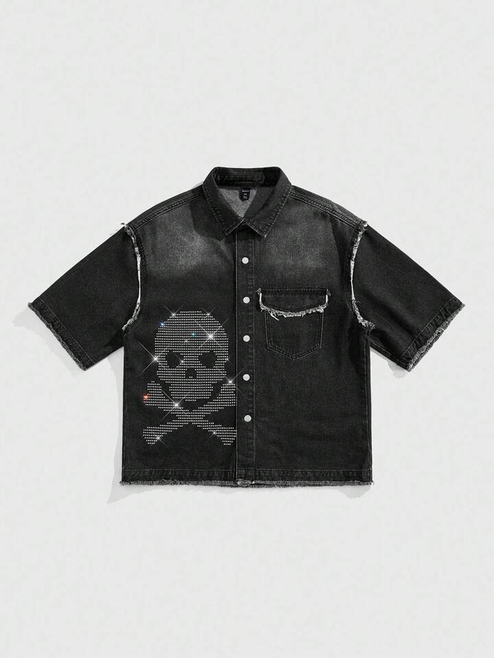 Goth Camisa vaquera de ajuste caja estampada para hombre, camisa vaquera casual de manga corta