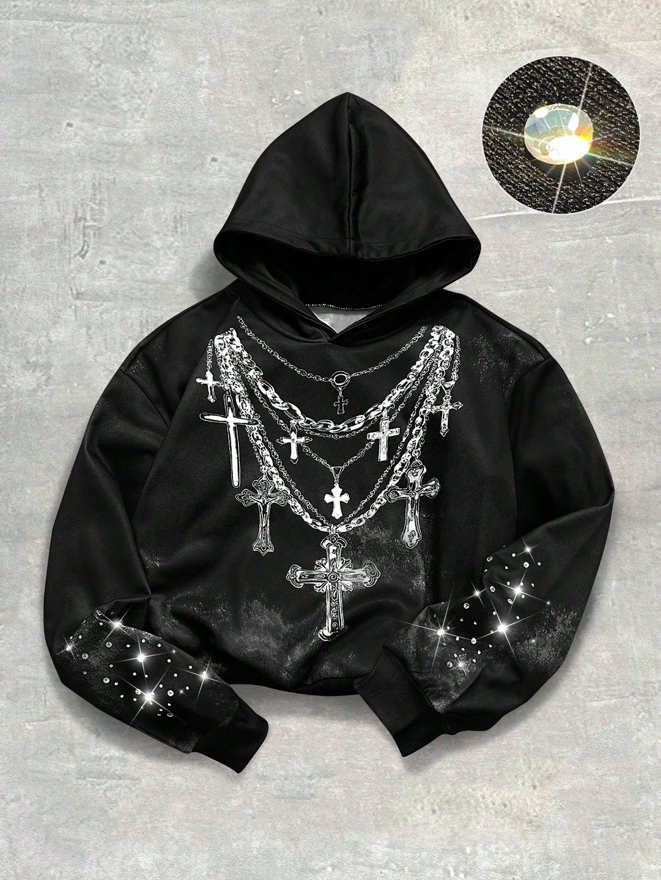Goth Sudadera con capucha casual de hombre con estampado de cruz, otoño/invierno