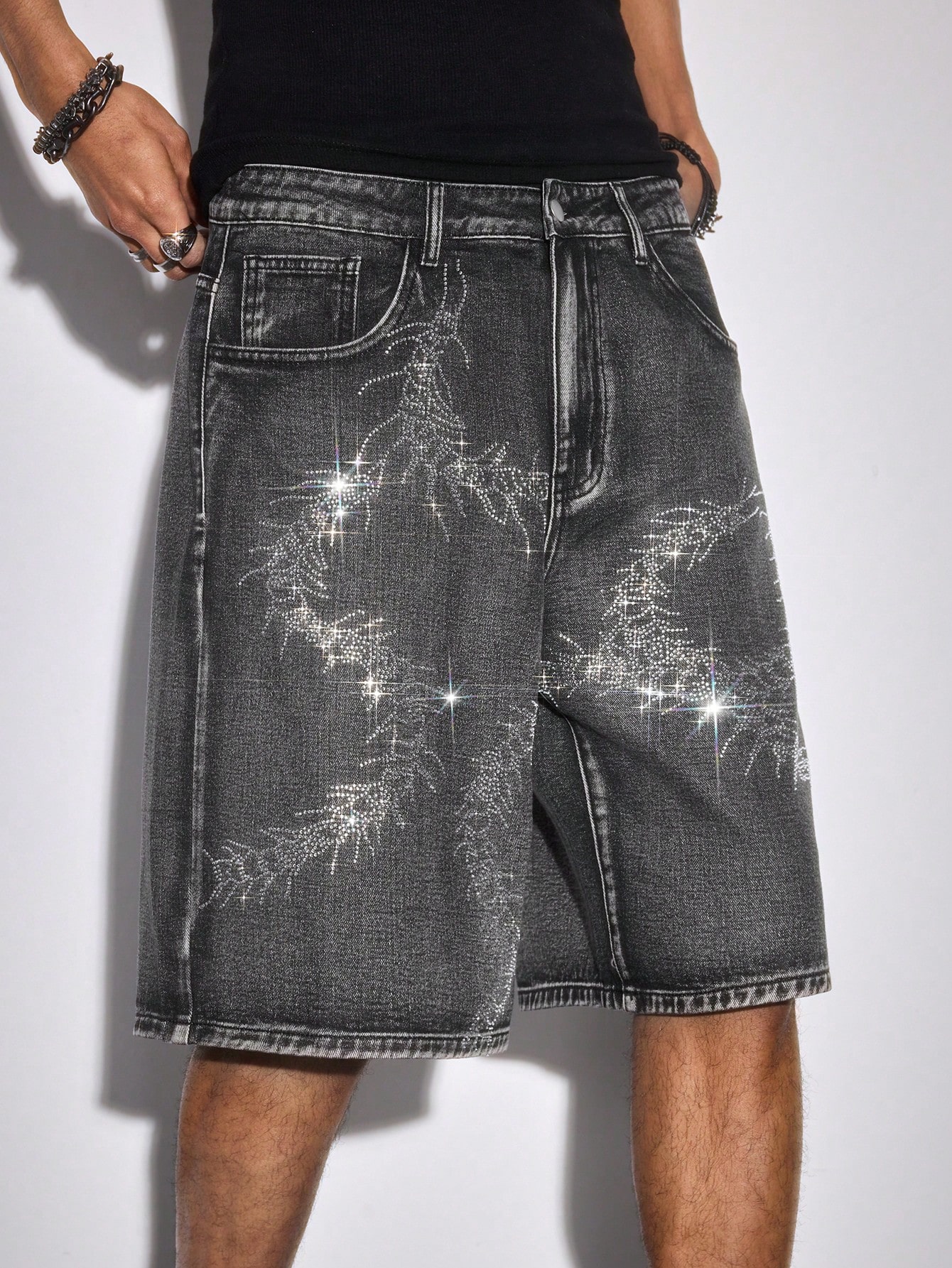 Goth Pantalones cortos de mezclilla casuales y de uso diario para hombres con bolsillos y botones con rhinestones