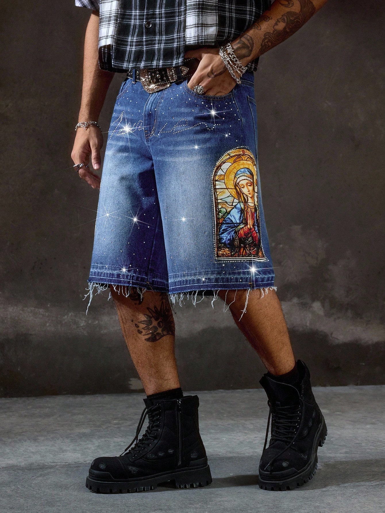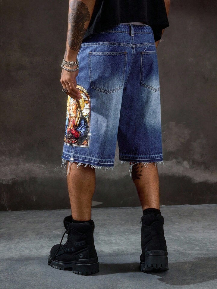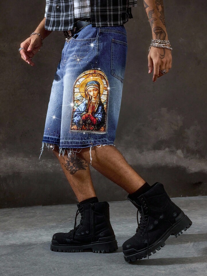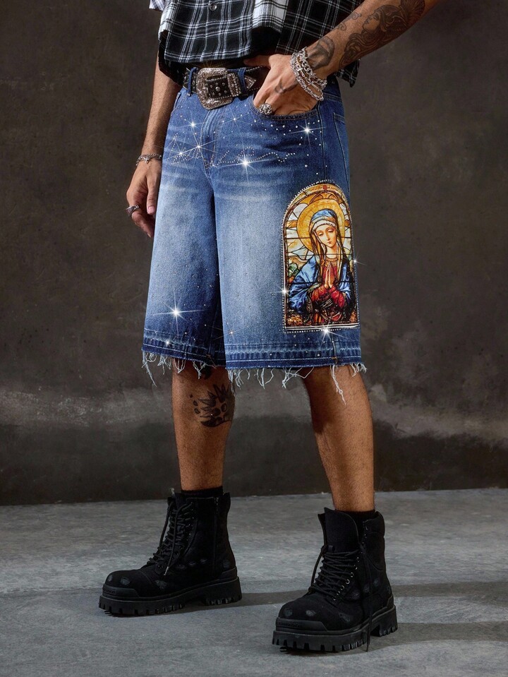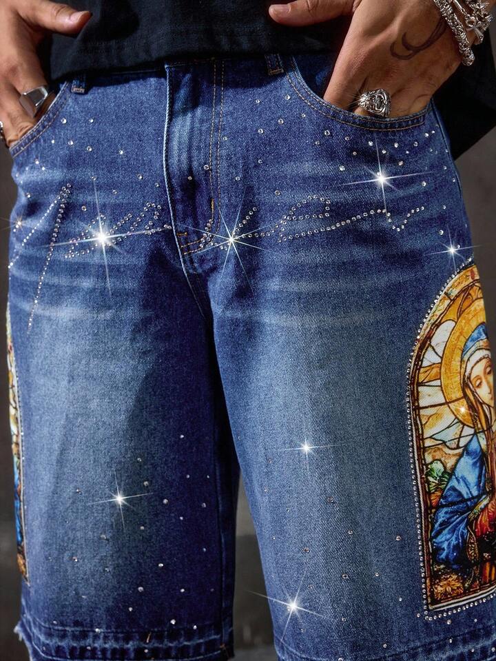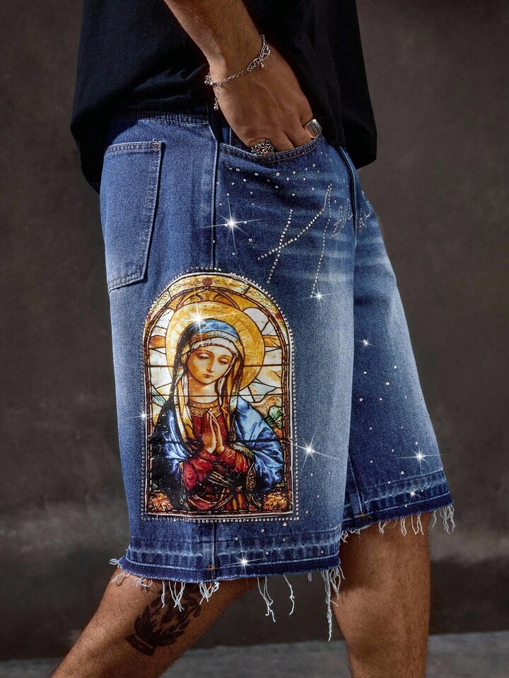 Goth Pantalones cortos vaqueros casuales de hombre con estampado de Virgen María y adornos de rhinestone, para verano