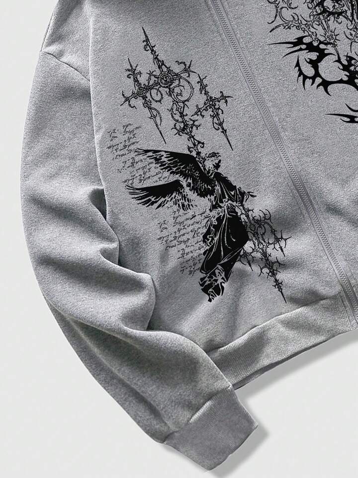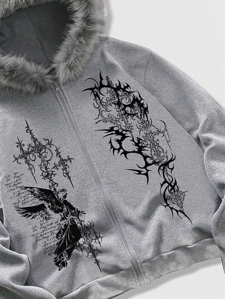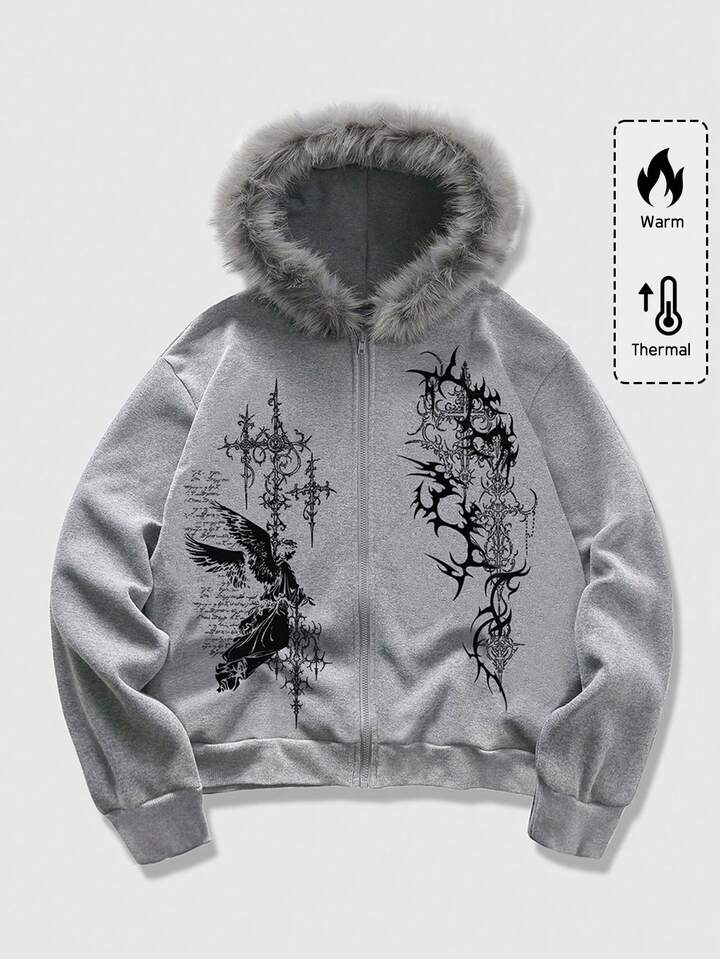 Goth Sudadera con capucha con cremallera, estampado de cruz, casual y cálida, con cuello de piel, para otoño/invierno