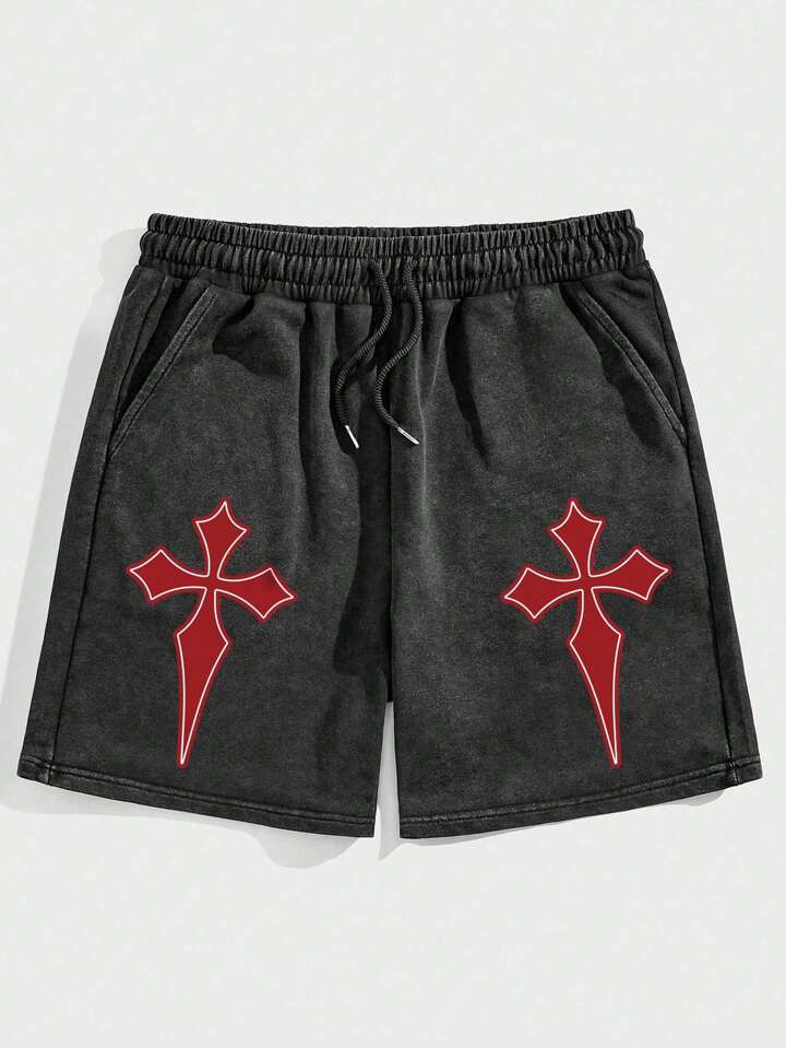 Goth Pantalones cortos sueltos de verano para hombre con estampado de cruz de calle casual, lavados, con cordón en la cintura
