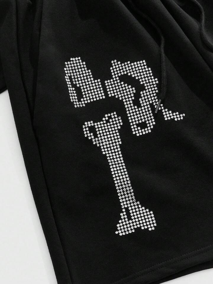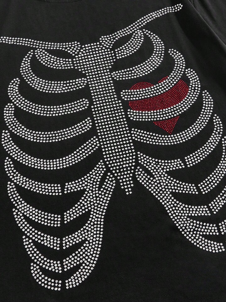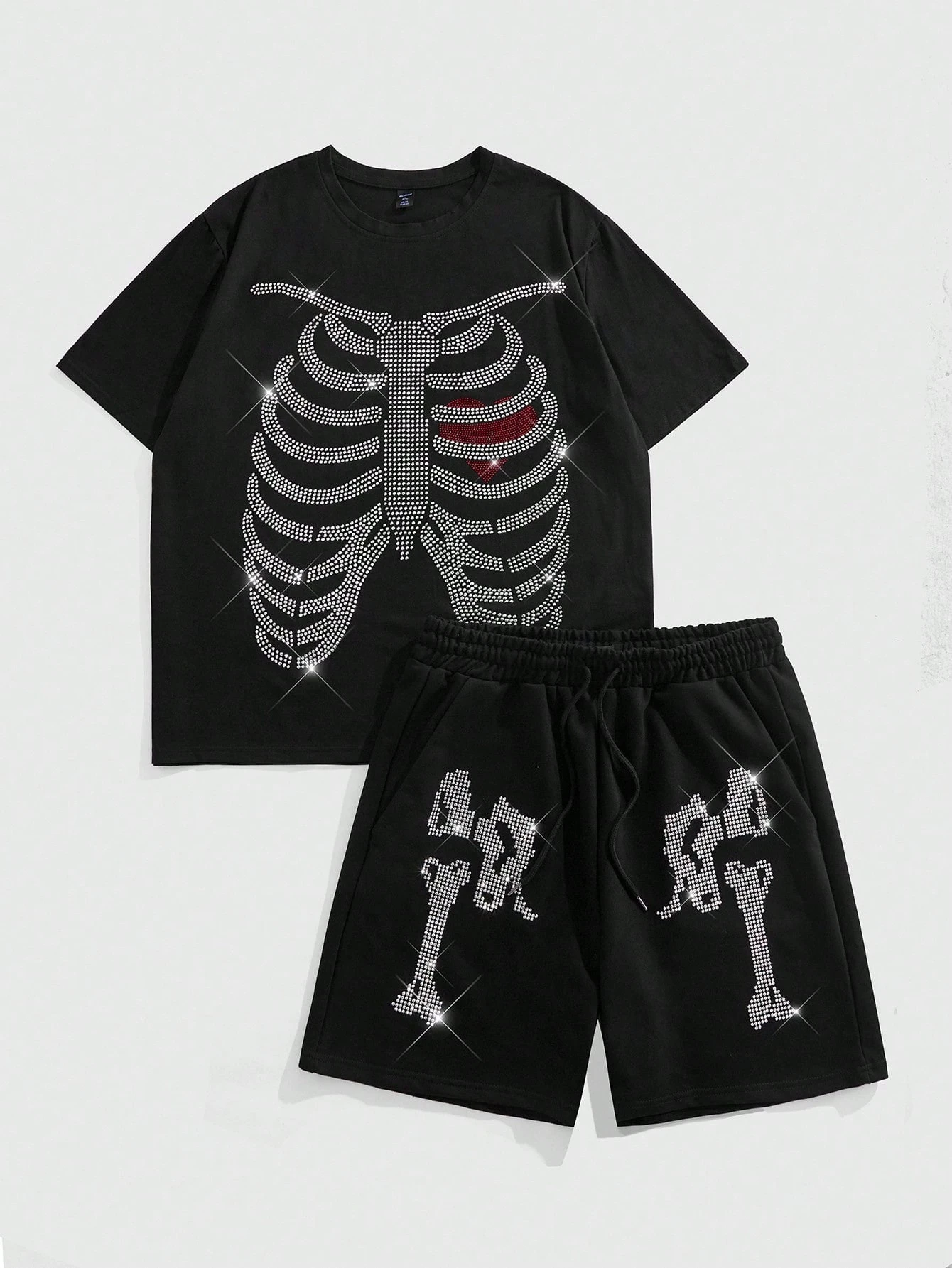 Goth Conjunto de camiseta y pantalones cortos de hombre con esqueleto decorado con rhinestones, para verano y Halloween