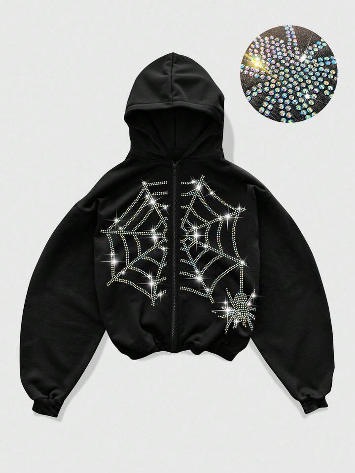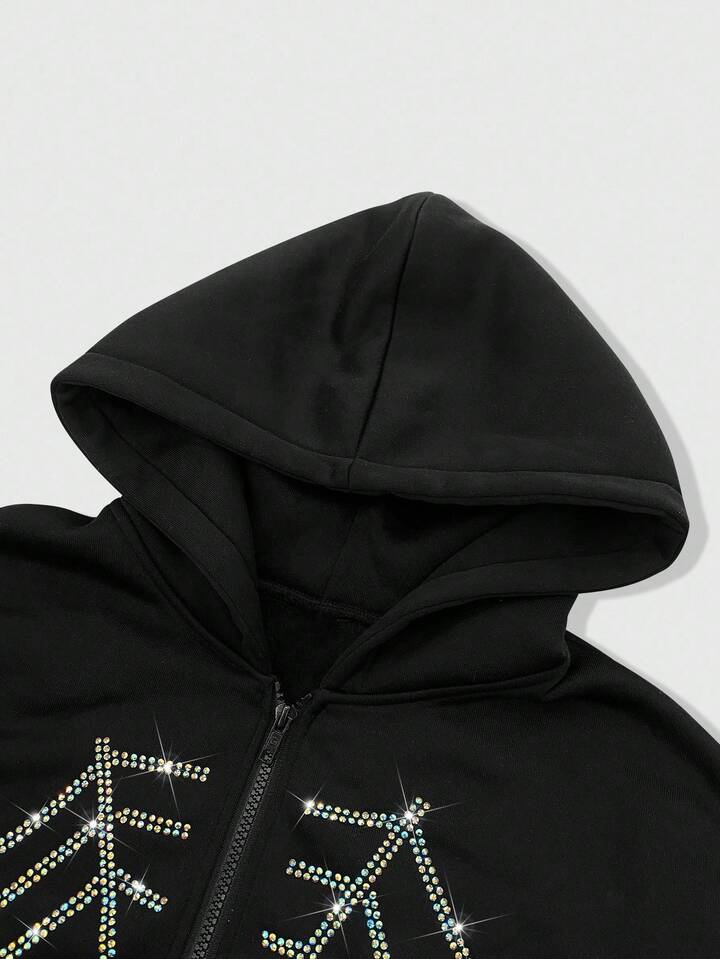 Goth Sudadera con capucha casual con cremallera y adornos de rhinestone para hombres, otoño