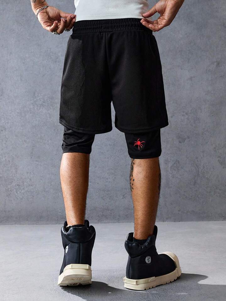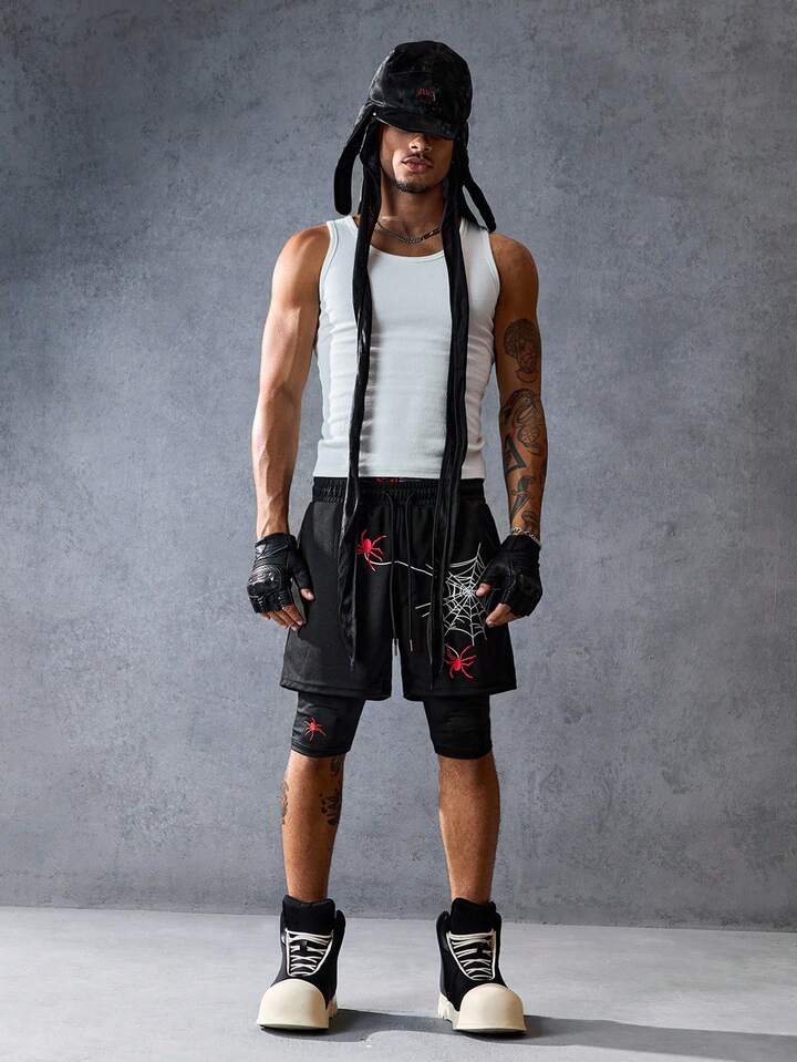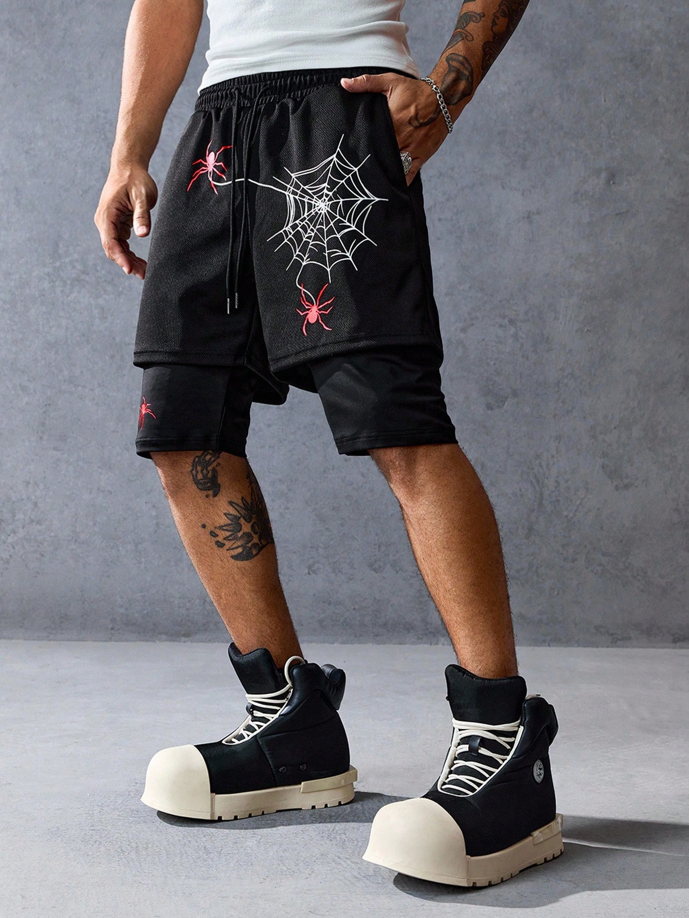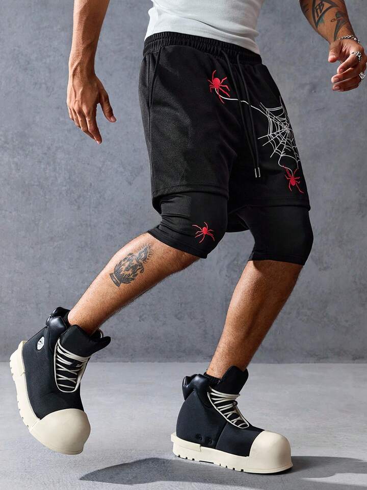 Goth Pantalones cortos con estampado de araña, cintura con cordón y bolsillos, de doble capa, para Halloween