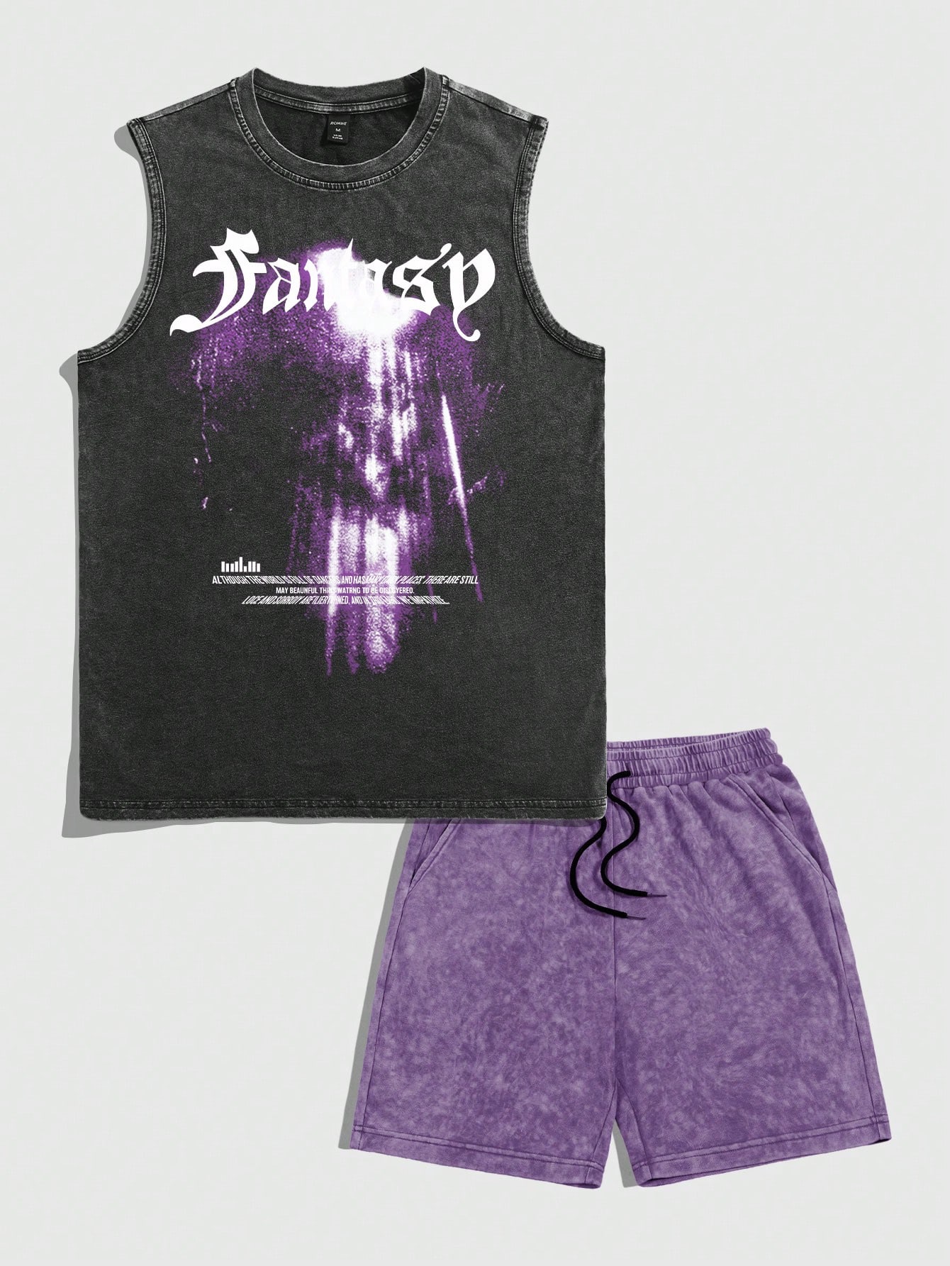 Goth Conjunto de camiseta de tirantes con eslogan impreso y pantalones cortos casuales de verano para hombre