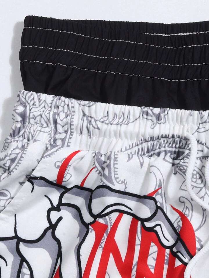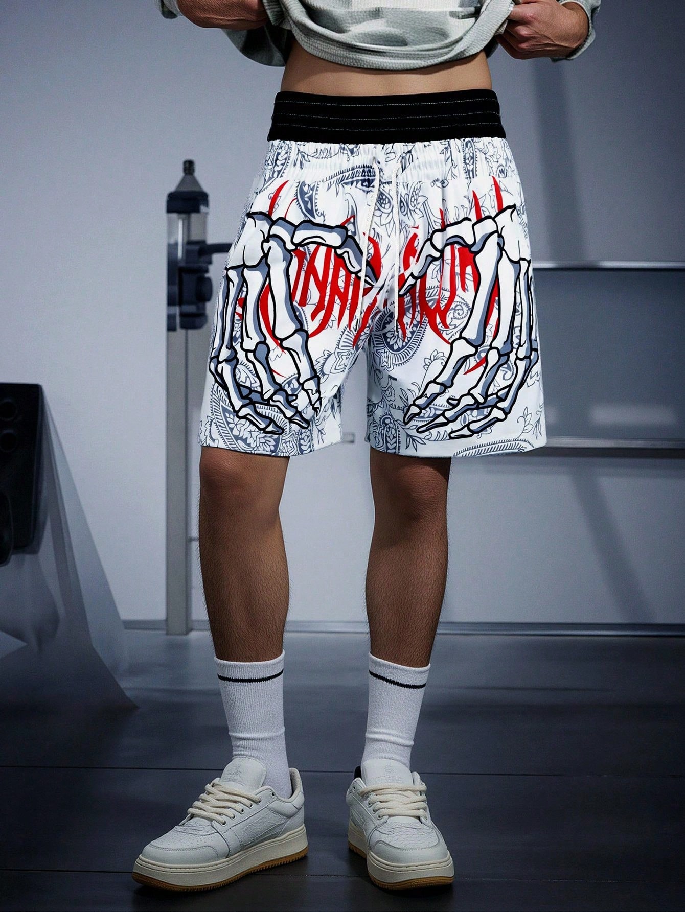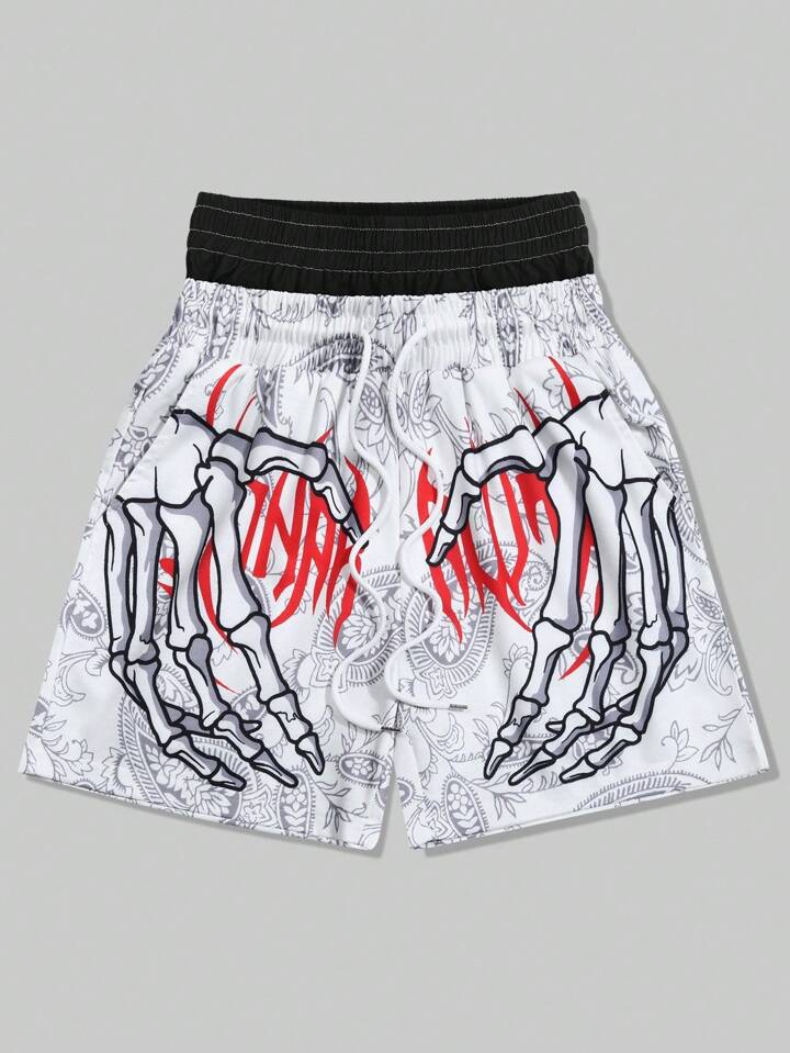 Goth Shorts de verano para hombre con estampado de calavera de mano, cordón en la cintura y doble cintura