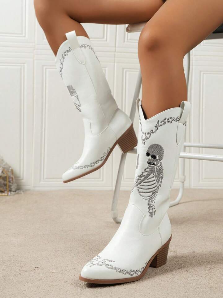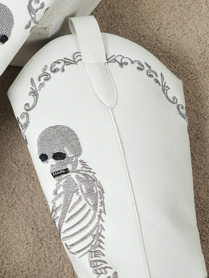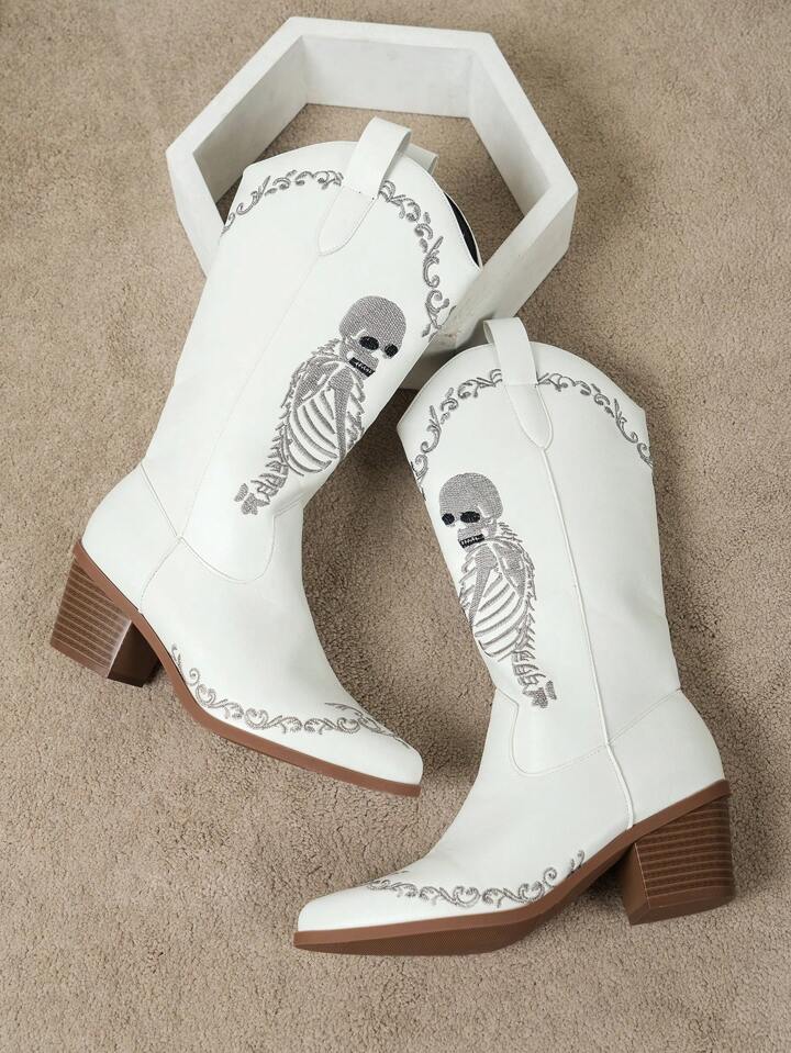 Goth Nuevas botas altas de cuatro estaciones para exportación cruzada con bordado de calavera para mujer, botas vaqueras, botas blancas