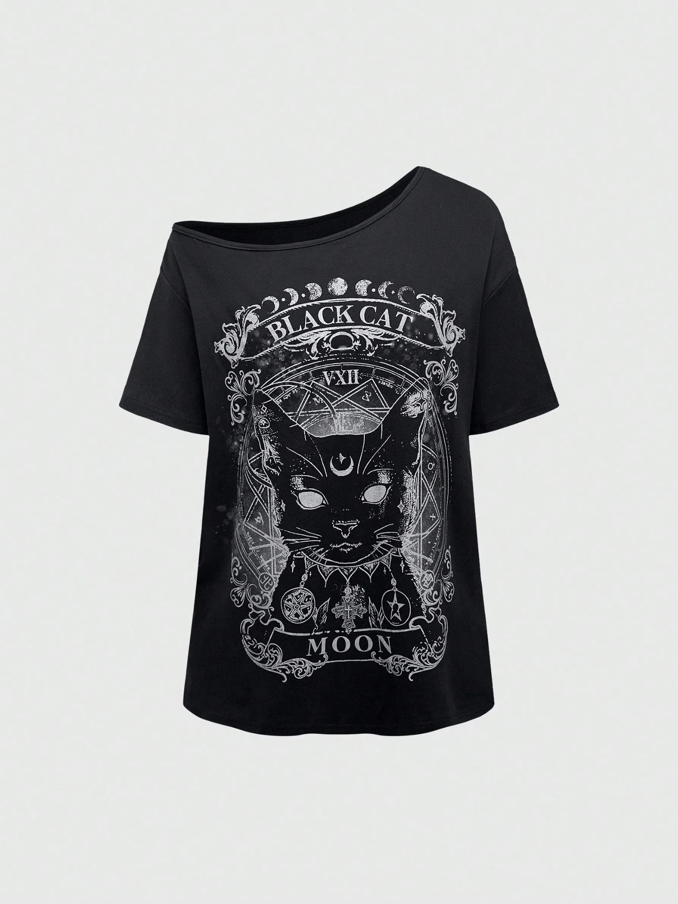 Goth Camiseta de manga corta holgada de gato negro sobredimensionado, misteriosa y de hombros caídos