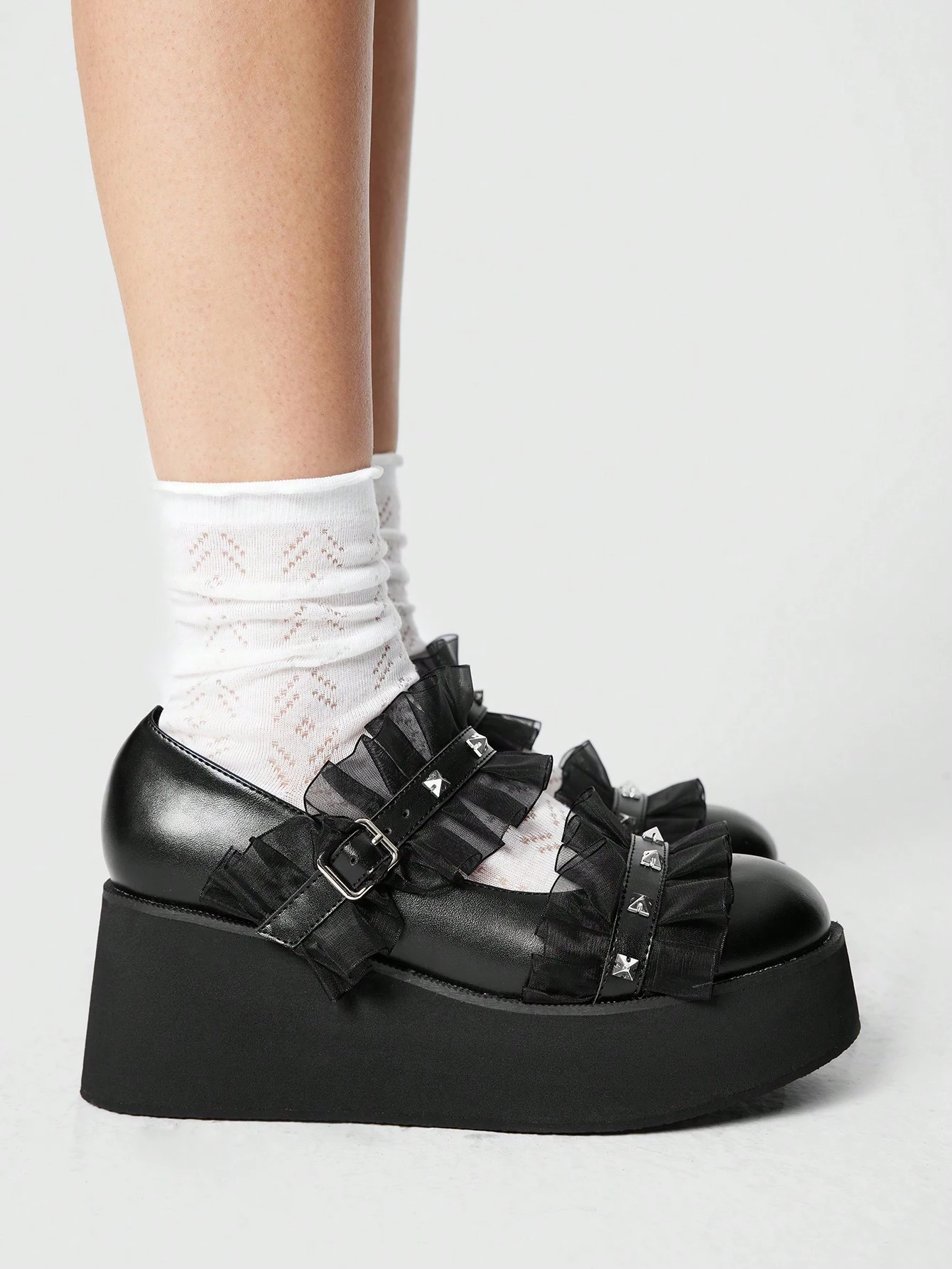 Goth Zapatos de plataforma con cuña de estilo punk de recubierto negro, con volantes de malla, remaches decorativos, puntera redonda y suela gruesa, de estilo casual/punk