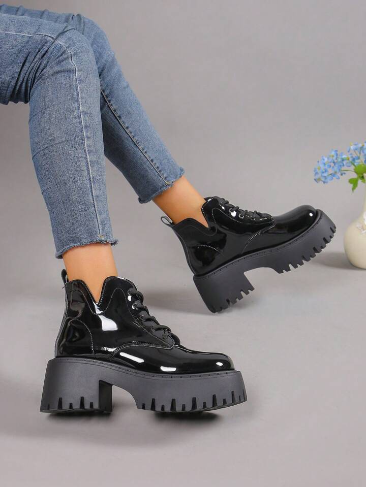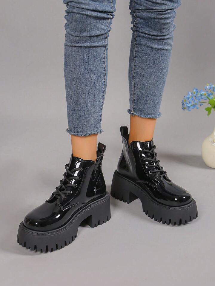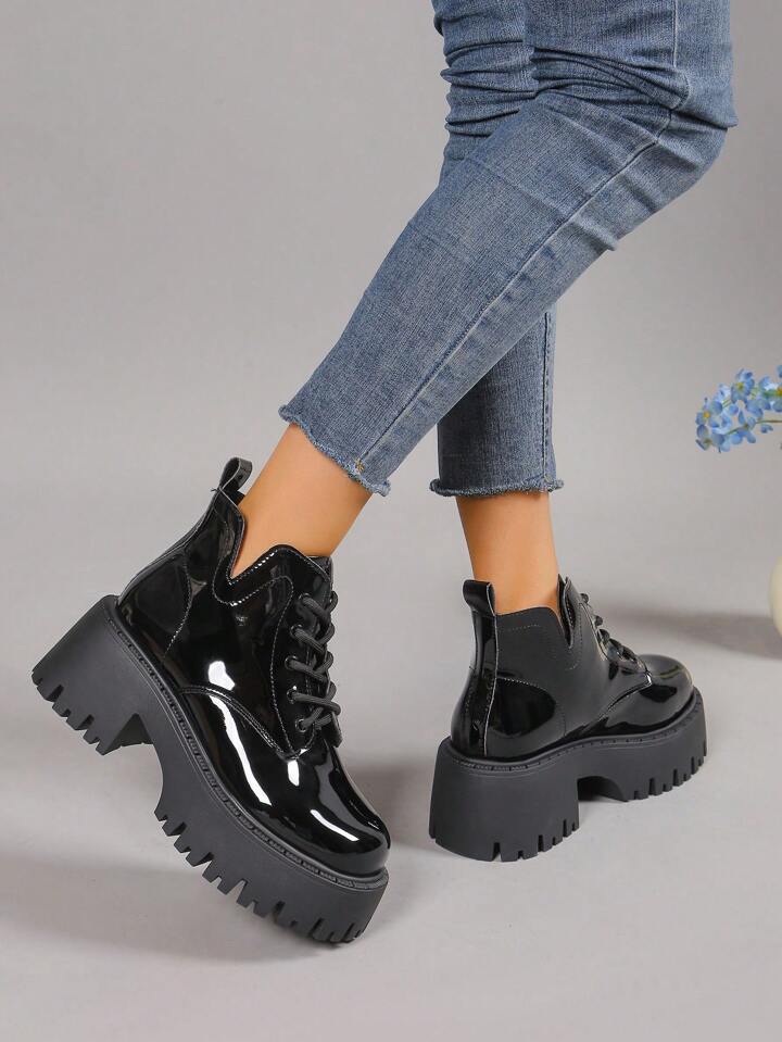 Goth Botines cortos de cuña con cordones brillante para mujer y suela gruesa