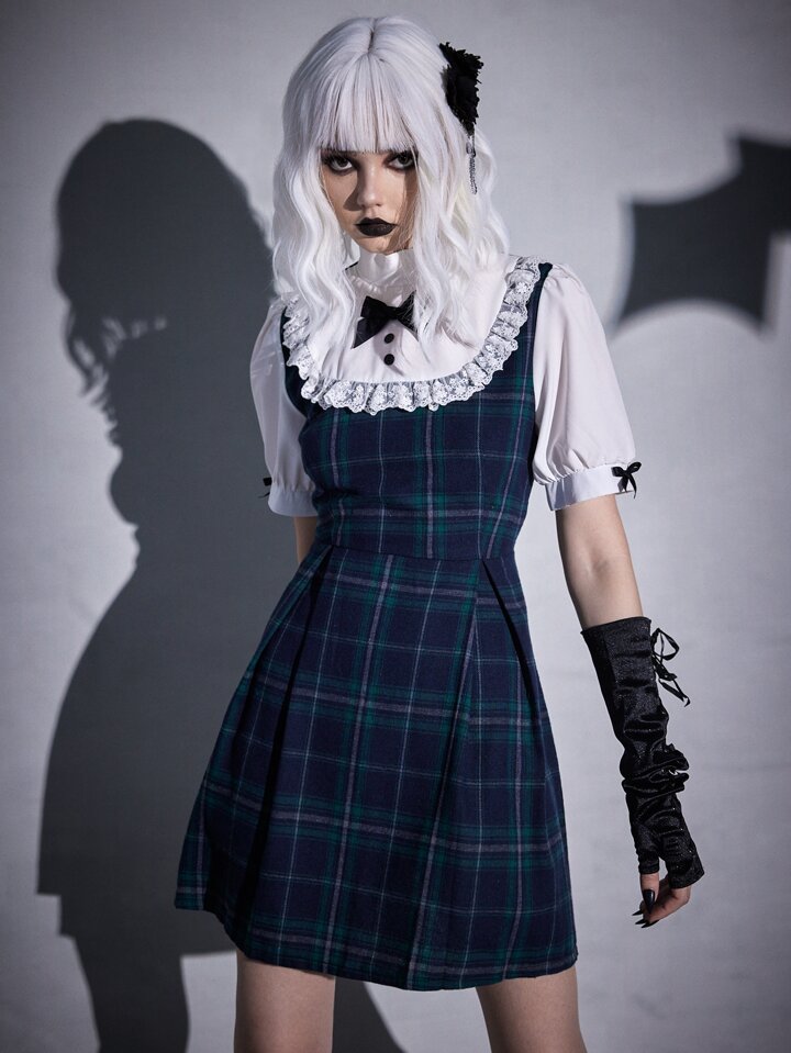Goth Vestido con estampado de cuadros con lazo delantero ribete con encaje