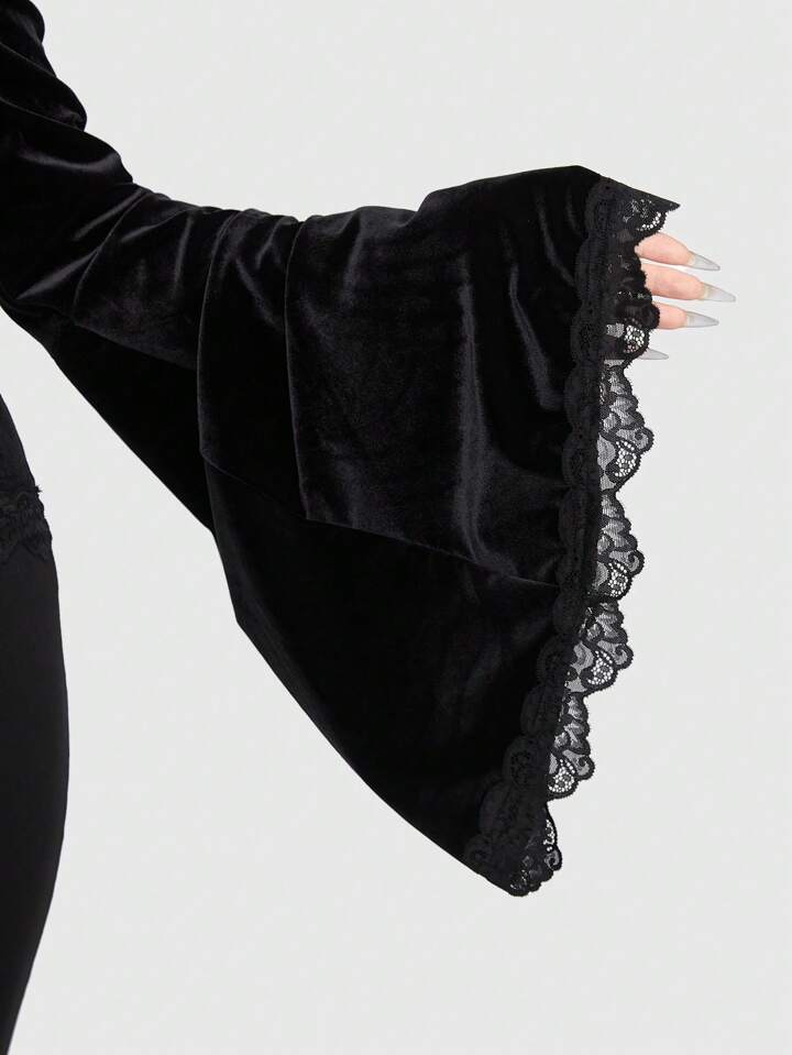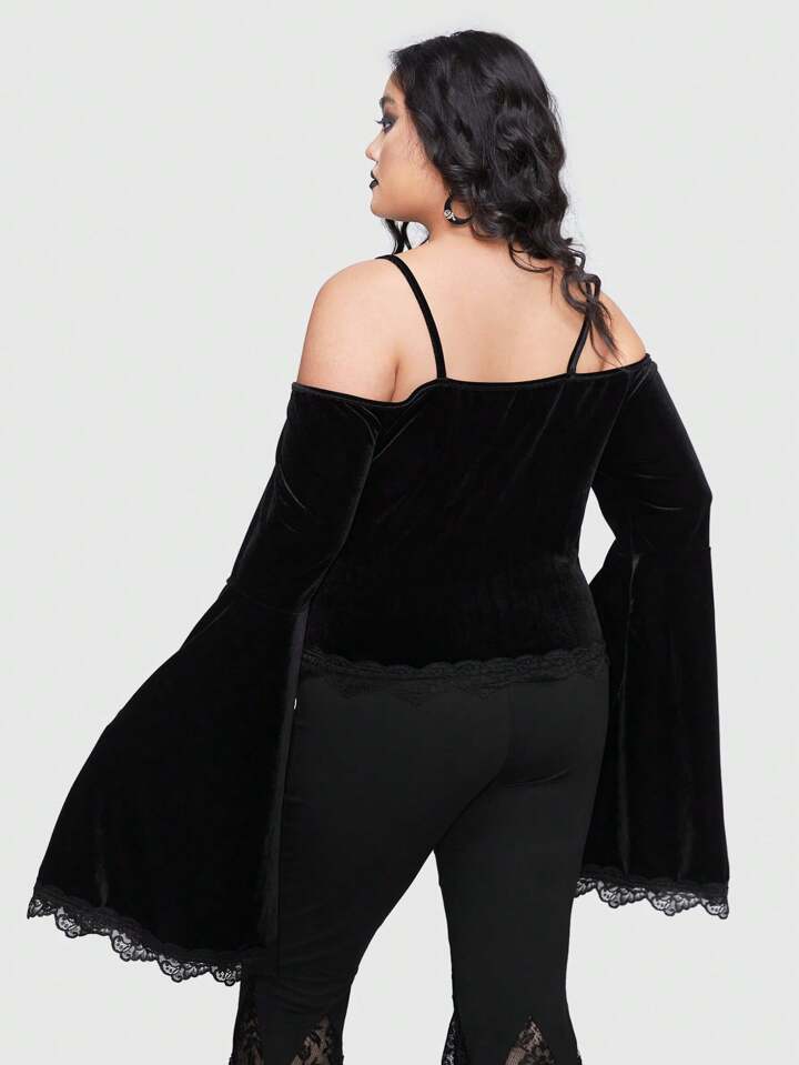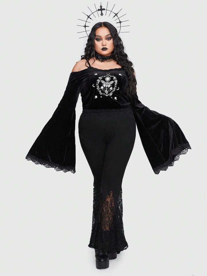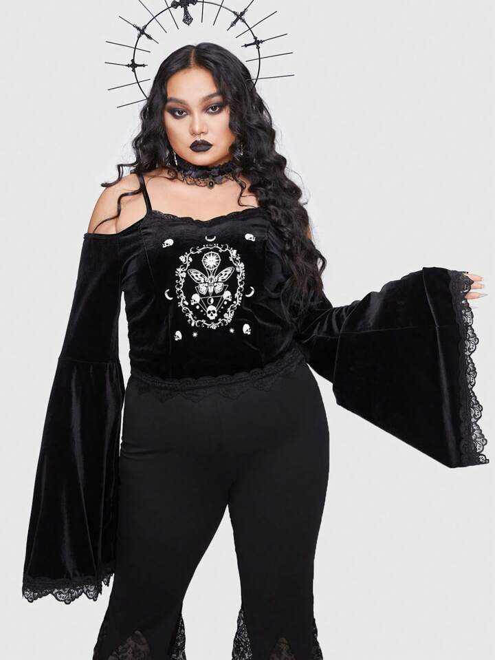 Goth Talla grande 1 pieza Camiseta de cráneo & con estampado de mariposa de hombros descubiertos ribete con encaje manga de campana de terciopelo