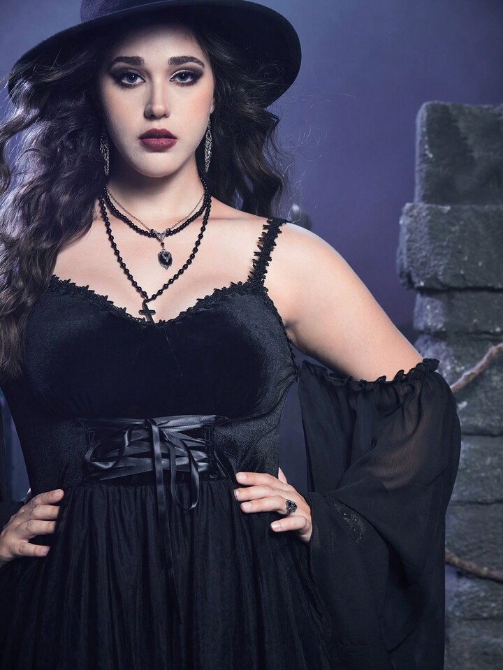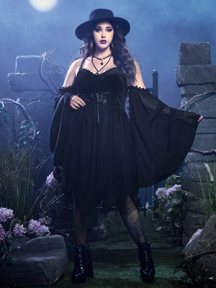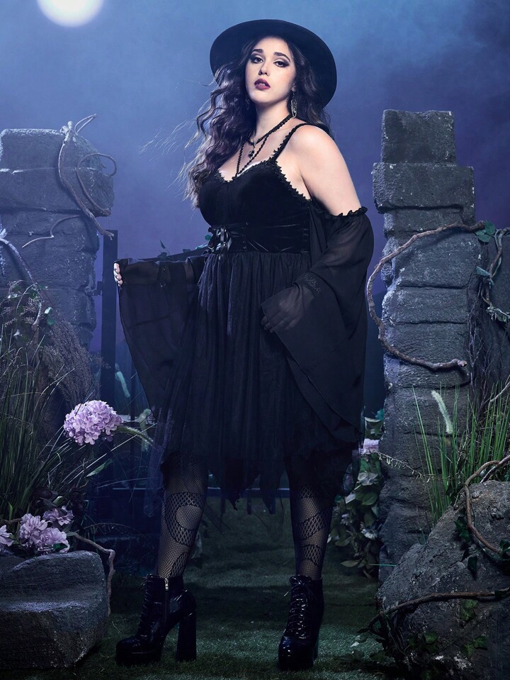 Goth Talla grande Vestido de hombros descubiertos ribete fruncido de malla