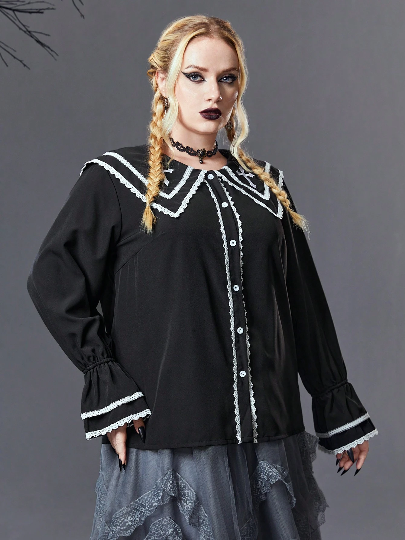Goth Talla grande Blusa cuello marinero de manga con volante