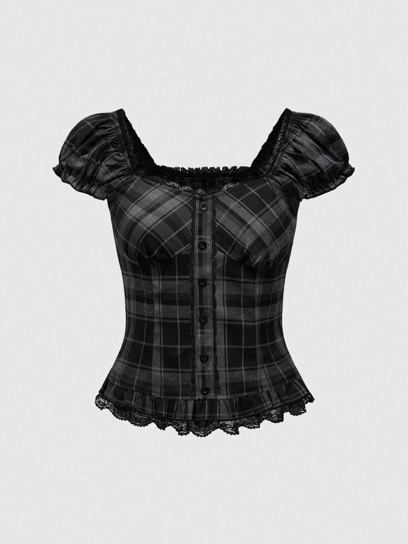 Goth Blusa de cuello volante de mangas cortas con efecto globo y volantes de encaje en el bajo, a cuadros, para tallas grandes, con estilo universitario