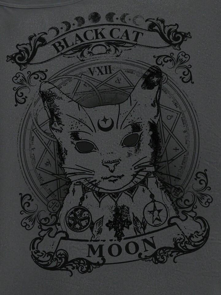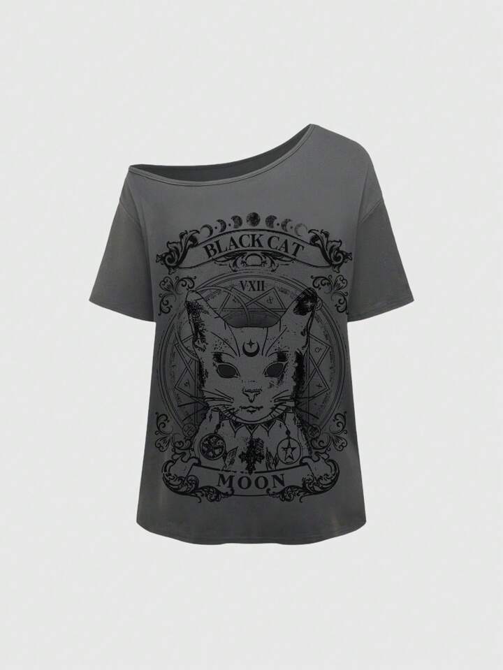 Goth Camiseta de manga corta talla grande oversize con estampado de gato, cuello asimétrico y hombros caídos