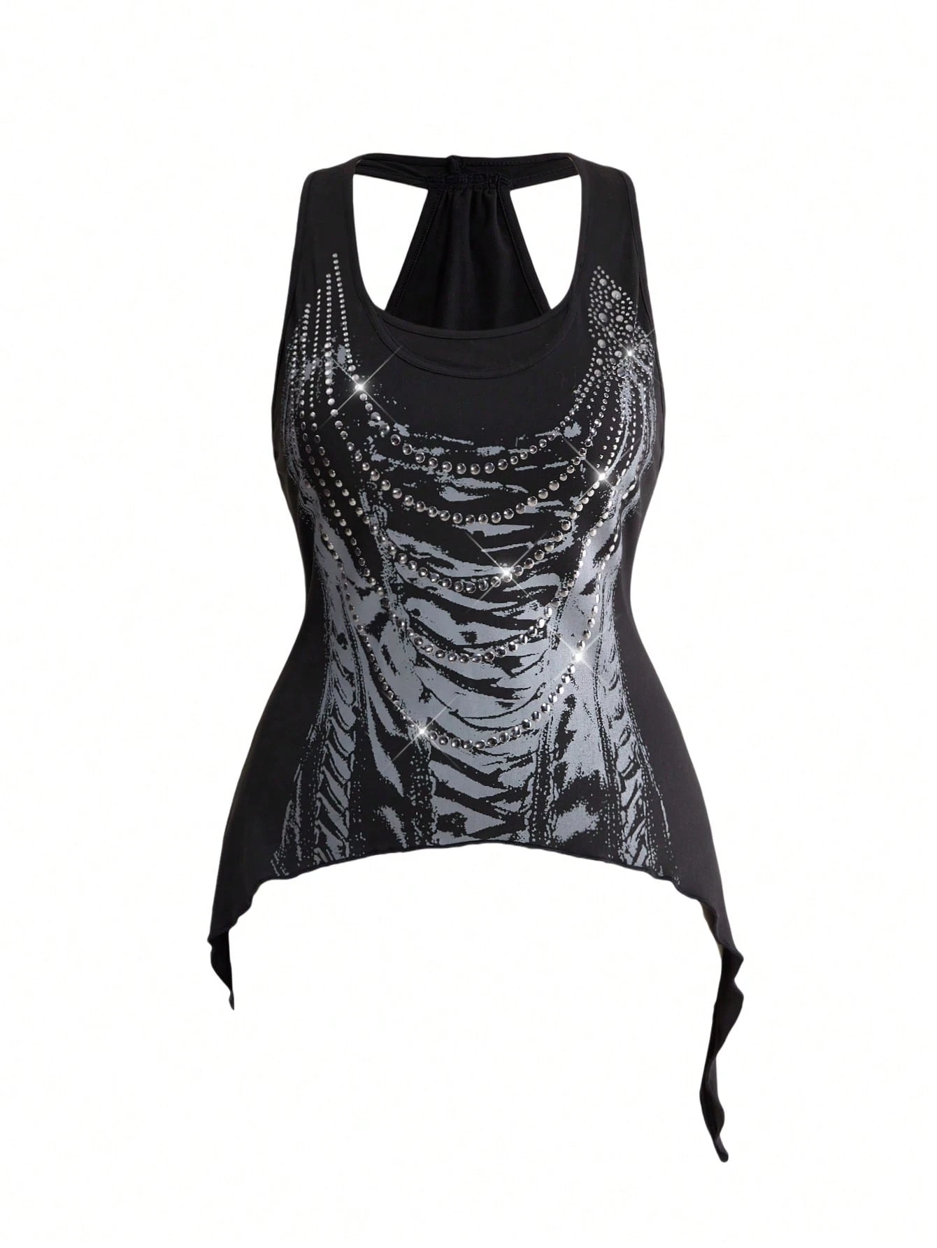 Goth Blusa de tirantes con cuello halter, bajo asimétrico y detalles de strass, para tallas grandes, de estilo casual de verano