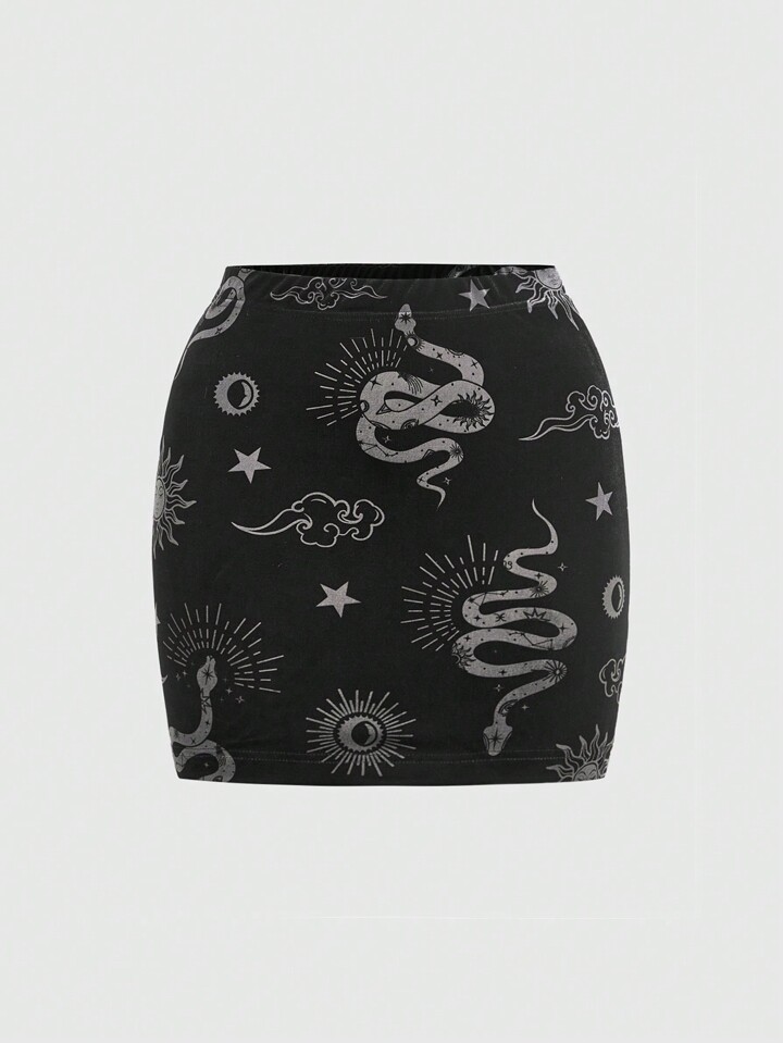 Goth Falda De Tubo De Terciopelo Con Estampado De Serpiente, Sol, Luna Y Estrellas En Tamaño Grande