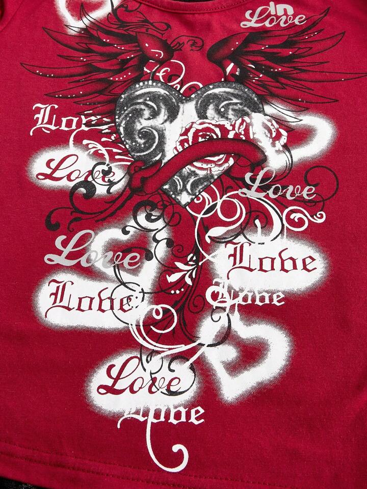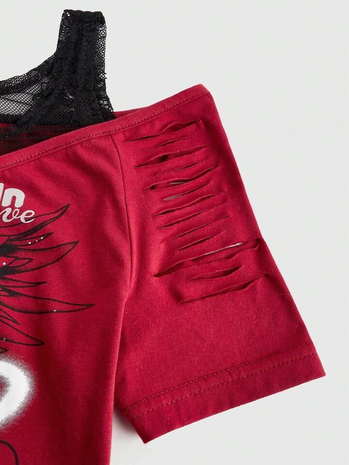 Goth Camiseta de manga corta con hombros descubiertos, encaje de contraste y estampado de corazones y letras, para mujer talla grande de verano